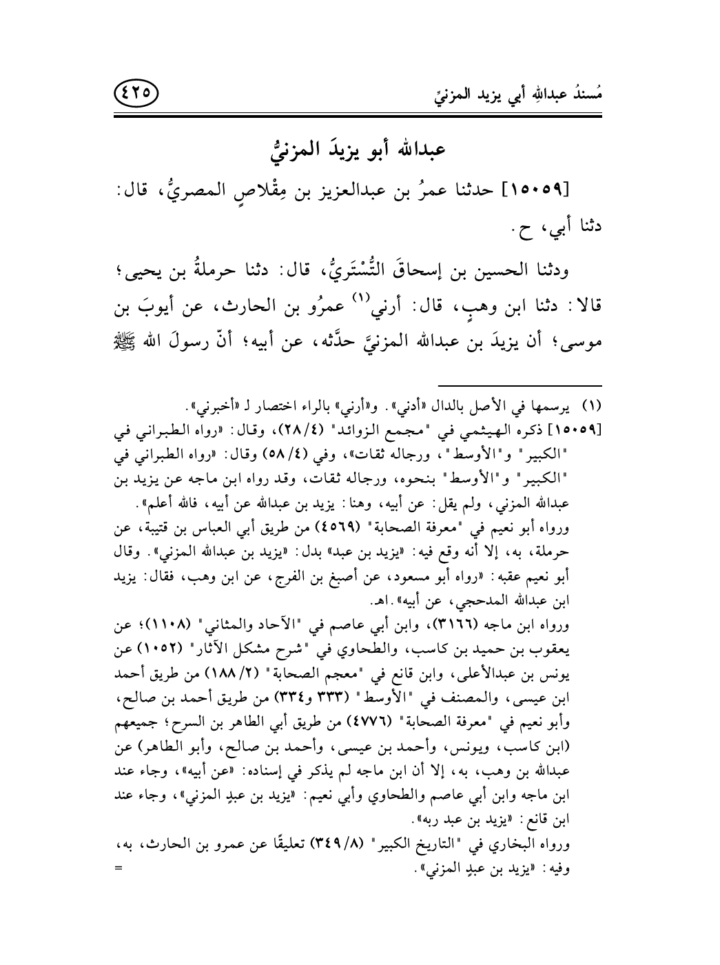 [15059] ذكره الهيثمي في "مجمع الزوائد" (4/28) ، وقال: «رواه الطبراني في "الكبير" و"الأوسط"، ورجاله ثقات» ، وفي (4/58) وقال: «رواه الطبراني في "الكبير" و"الأوسط" بنحوه، ورجاله ثقات، وقد رواه ابن ماجه عن يزيد بن عبد الله المزني، ولم يقل: عن أبيه، وهنا: يزيد بن عبد الله عن أبيه، فالله أعلم» .