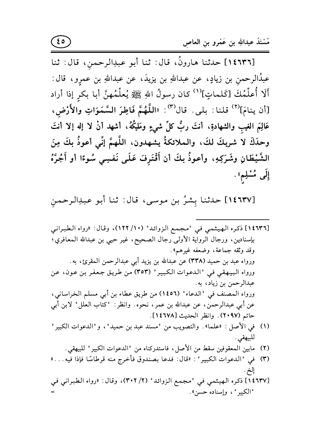 14636 - حدثنا هارونُ، قال: ثنا أبو عبدِالرحمنِ، قال: ثنا عبدُالرحمنِ بن زيادٍ، عن عبد اللهِ بن يزيدَ، عن عبد اللهِ بن عمرٍو، قال: أَلاَ أُعلِّمُكَ [كَلماتٍ] (¬1) كان رسولُ اللهِ صلى الله عليه وسلم يُعلِّمُهنَّ أبا بكرٍ إذا أراد [أن ينامَ] (¬2) قلنا: بلى. قال (¬3) : «اللَّهُمَّ فَاطِرَ السَّمَوَاتِ والأَرْضِ، عَالِمَ الغيبِ والشهادةِ، أنتَ ربُّ كلِّ شيءٍ ومَليكُهُ، أشهد أنْ لا إله إلا أنتَ وحدَكَ لا شريكَ لكَ، والملائكةُ يشهدون، اللَّهمَّ إنِّي أعوذُ بكَ مِنَ الشَّيْطَانِ وشَرَكِهِ، وأعوذُ بكَ أن أَقْتَرِفَ عَلَى نَفسِي سُوءًا أو أَجُرَّهُ إِلَى مُسْلِمٍ» .