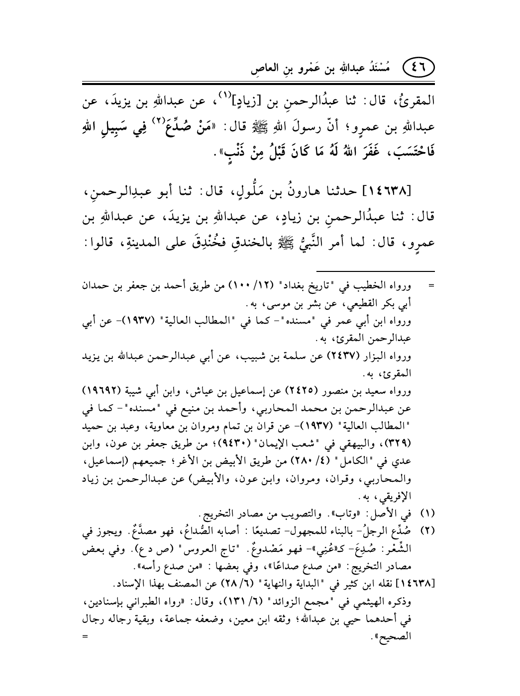 14638 - حدثنا هارونُ بن مَلُّولٍ، قال: ثنا أبو عبدِالرحمنِ، قال: ثنا عبدُالرحمنِ بن زيادٍ، عن عبد اللهِ بن يزيدَ، عن عبد اللهِ بن عمرٍو، قال: لما أمر النَّبيُّ صلى الله عليه وسلم بالخندقِ فخُنْدِقَ على المدينةِ، قالوا: -[47]- يا رسولَ اللهِ، إنَّا وَكَدْنَا (¬1) صَفًا (¬2) لا نستطيعُ حفرَها! فقام النَّبيُّ صلى الله عليه وسلم وقمنا معه، فلما أتى أخذَ المِعْوَلَ فضرب به ضربةً وكَبَّرَ، فسمعتُ هَدَّةً لم أسمعْ مثلَها قطُّ، فقال: «فُتِحَتْ فَارِسُ!!» ثم ضَرب أخرى وكَبَّرَ، فسمعتُ هَدَّةً لم أسمعْ مثلَها قطُّ، / فقال: «فُتِحَتِ الرُّومُ!!» ثم ضَرب [س: 6/أ]