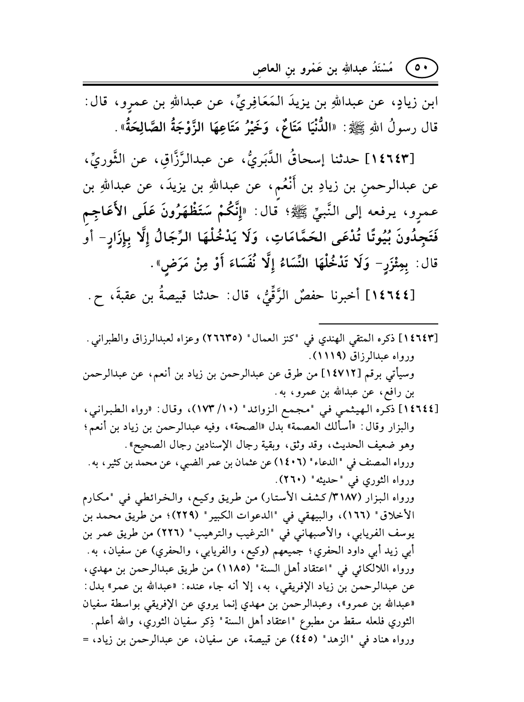 14643 - حدثنا إسحاقُ الدَّبَريُّ، عن عبد الرَّزَّاقِ، عن الثَّوريِّ، عن عبد الرحمنِ بن زيادِ بن أَنْعُمٍ، عن عبد اللهِ بن يزيدَ، عن عبد اللهِ بن عمرٍو، يرفعه إلى النَّبيِّ صلى الله عليه وسلم؛ قال: «إِنَّكُمْ سَتَظْهَرُونَ عَلَى الأَعَاجِمِ فَتَجِدُونَ بُيُوتًا تُدْعَى الحَمَّامَاتِ، وَلاَ يَدْخُلْهَا الرِّجَالُ إِلاَّ بِإِزَارٍ - أو قال: بِمِئْزَرٍ- وَلاَ تَدْخُلْهَا النِّسَاءُ إِلاَّ نُفَسَاءَ أَوْ مِنْ مَرَضٍ» .