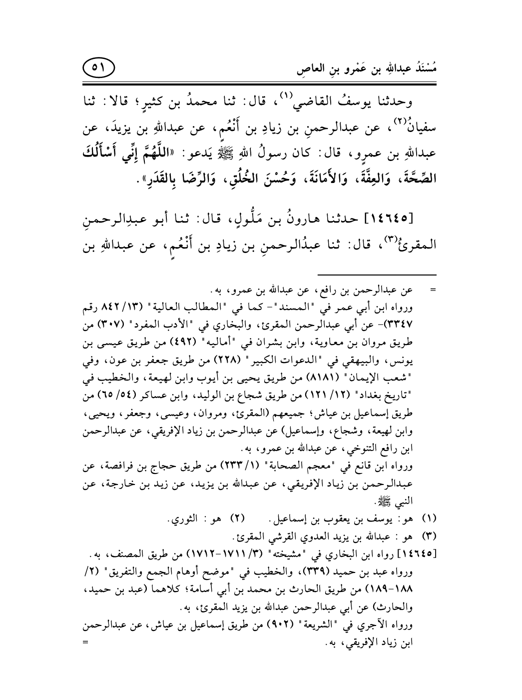 14645 - حدثنا هارونُ بن مَلُّولٍ، قال: ثنا أبو عبدِالرحمنِ المقرئُ (¬1) ، قال: ثنا عبدُالرحمنِ بن زيادِ بن أَنْعُمٍ، عن عبد اللهِ بن -[52]- يزيدَ، عن عبد اللهِ بن عمرٍو، قال: قال رسولُ اللهِ صلى الله عليه وسلم: «يُؤْتَى بِرَجُلٍ يَوْمَ القِيَامَةِ، ثُمَّ يُؤْتَى بِالمِيزَانِ، ثُمَّ يُؤْتَى بِتِسْعَةٍ وَتِسْعِينَ سِجِلًّا، كُلُّ سِجِلٍّ مِنْهَا مَدُّ البَصَرِ؛ فِيهَا ذُنُوبُهُ وَخَطَايَاهُ، فَتُوضَعُ فِي كِفَّةِ المِيزَانِ، ثُمَّ يُؤْتَى بِقِرْطَاسٍ مِثْلِ هَذَا» - وأشار بيدِه وأمسكَ بإبهامِهِ (¬2) - «فِيهَا (¬3) شَهَادَةُ أَنْ لاَ إِلَهَ إِلاَّ اللهُ وَأَنَّ مُحَمَّدًا رَسُولُ اللهِ، فَتُوضَعُ (¬4) فِي الكِفَّةِ؛ فَتَرْجَحُ بِذُنُوبِهِ وَخَطَايَاهُ» .