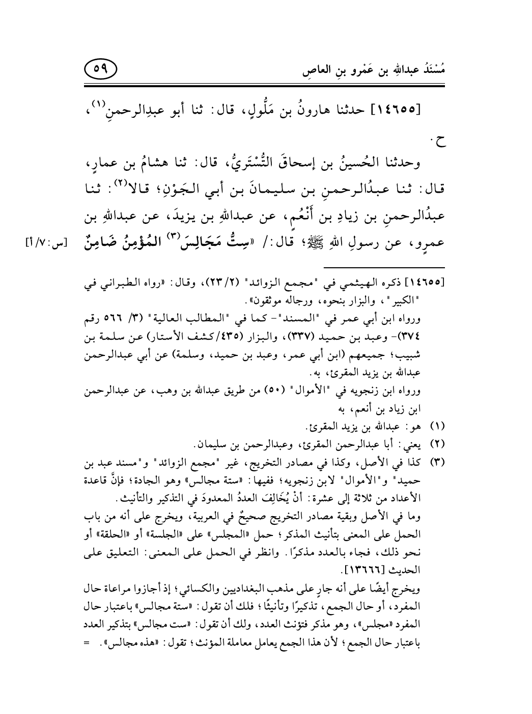 (¬3) كذا في الأصل، وكذا في مصادر التخريج، غير "مجمع الزوائد" و"مسند عبد بن حميد" و"الأموال" لابن زنجويه؛ ففيها: «ستة مجالس» وهو الجادة؛ فإنَّ قاعدة الأعداد من ثلاثة إلى عشرة: أنْ يُخَالِفَ العددُ المعدودَ في التذكير والتأنيث.