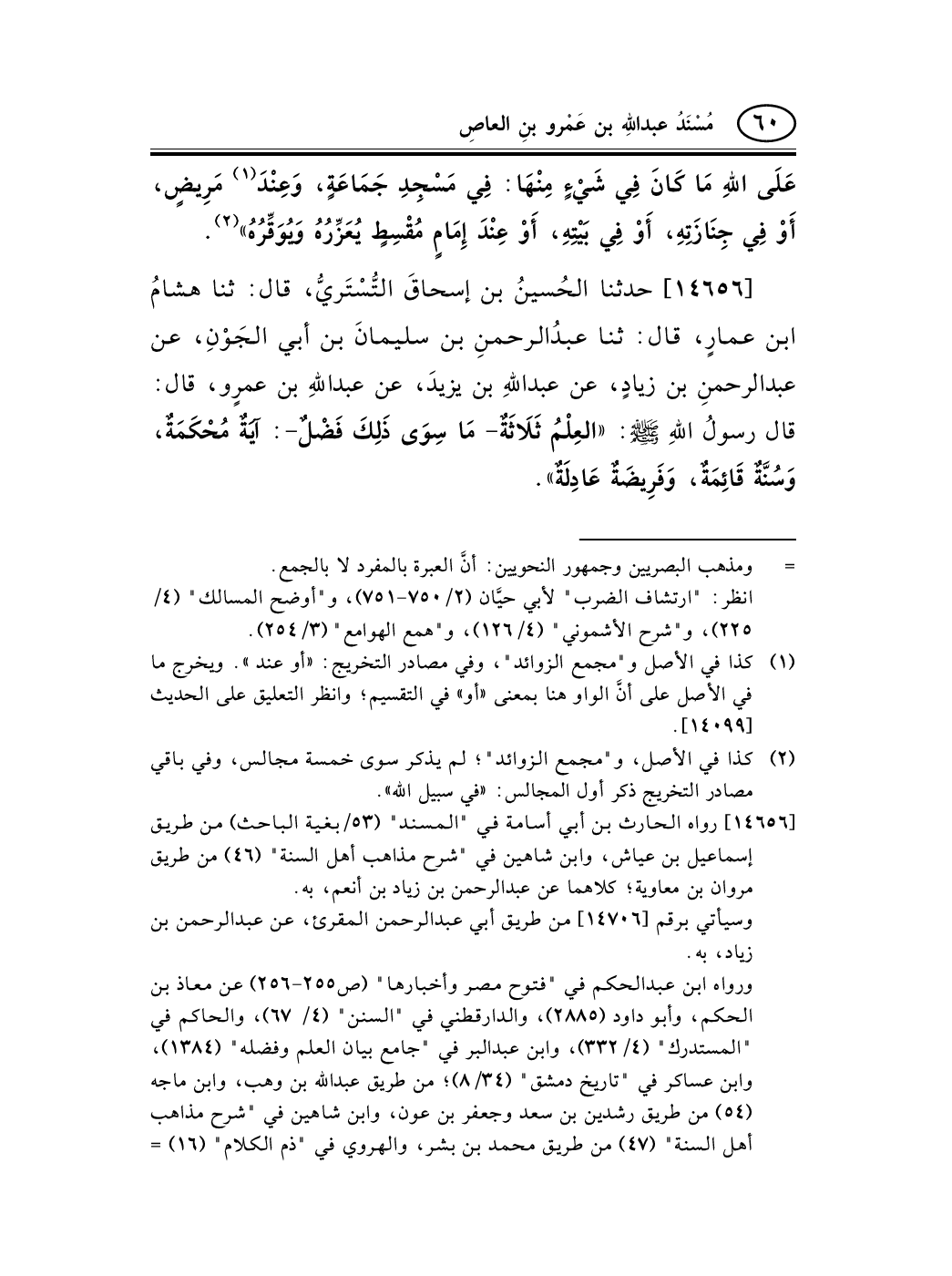 14656 - حدثنا الحُسينُ بن إسحاقَ التُّسْتَريُّ، قال: ثنا هشامُ ابن عمارٍ، قال: ثنا عبدُالرحمنِ بن سليمانَ بن أبي الجَوْنِ، عن عبد الرحمنِ بن زيادٍ، عن عبد اللهِ بن يزيدَ، عن عبد اللهِ بن عمرٍو، قال: قال رسولُ اللهِ صلى الله عليه وسلم: «العِلْمُ ثَلاَثَةٌ- مَا سِوَى ذَلِكَ فَضْلٌ-: آيَةٌ مُحْكَمَةٌ، وَسُنَّةٌ قَائِمَةٌ، وَفَرِيضَةٌ عَادِلَةٌ» .