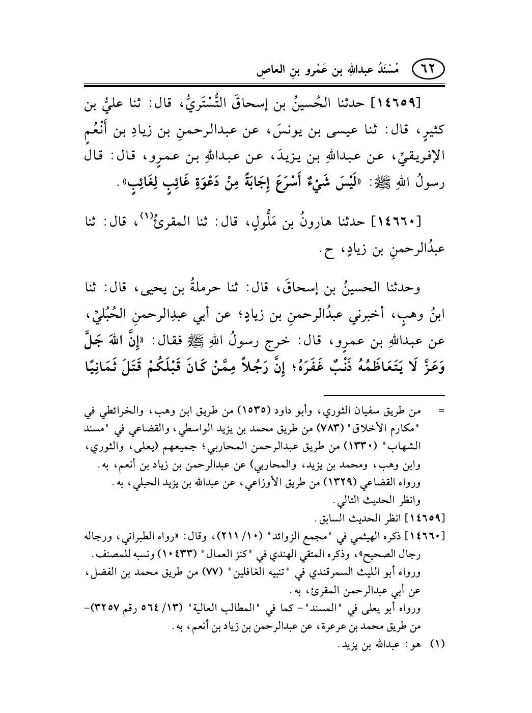 14659 - حدثنا الحُسينُ بن إسحاقَ التُّسْتَريُّ، قال: ثنا عليُّ بن كثيرٍ، قال: ثنا عيسى بن يونسَ، عن عبد الرحمنِ بن زيادِ بن أَنْعُمٍ الإفريقيِّ، عن عبد اللهِ بن يزيدَ، عن عبد اللهِ بن عمرٍو، قال: قال رسولُ اللهِ صلى الله عليه وسلم: «لَيْسَ شَيْءٌ أَسْرَعَ إِجَابَةً مِنْ دَعْوَةِ غَائِبٍ لِغَائِبٍ» .
