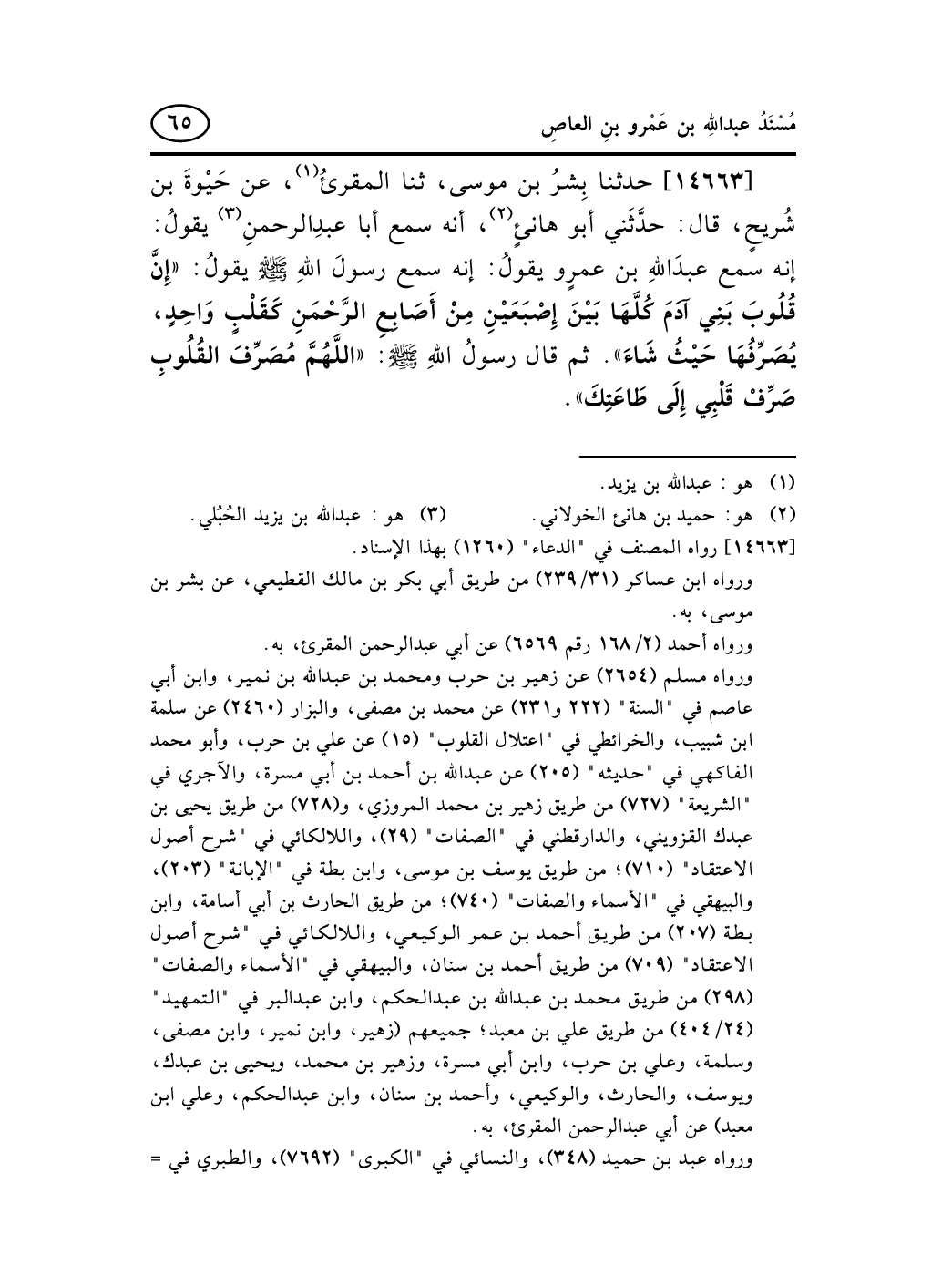 14663 - حدثنا بِشرُ بن موسى، ثنا المقرئُ (¬1) ، عن حَيْوةَ بن شُريحٍ، قال: حدَّثَني أبو هانئٍ (¬2) ، أنه سمع أبا عبدِالرحمنِ (¬3) يقولُ: إنه سمع عبدَاللهِ بن عمرٍو يقولُ: إنه سمع رسولَ اللهِ صلى الله عليه وسلم يقولُ: «إِنَّ قُلُوبَ بَنِي آدَمَ كُلَّهَا بَيْنَ إِصْبَعَيْنِ مِنْ أَصَابِعِ الرَّحْمَنِ كَقَلْبٍ وَاحِدٍ، يُصَرِّفُهَا حَيْثُ شَاءَ» . ثم قال رسولُ اللهِ صلى الله عليه وسلم: «اللَّهُمَّ مُصَرِّفَ القُلُوبِ صَرِّفْ قَلْبِي إِلَى طَاعَتِكَ» .