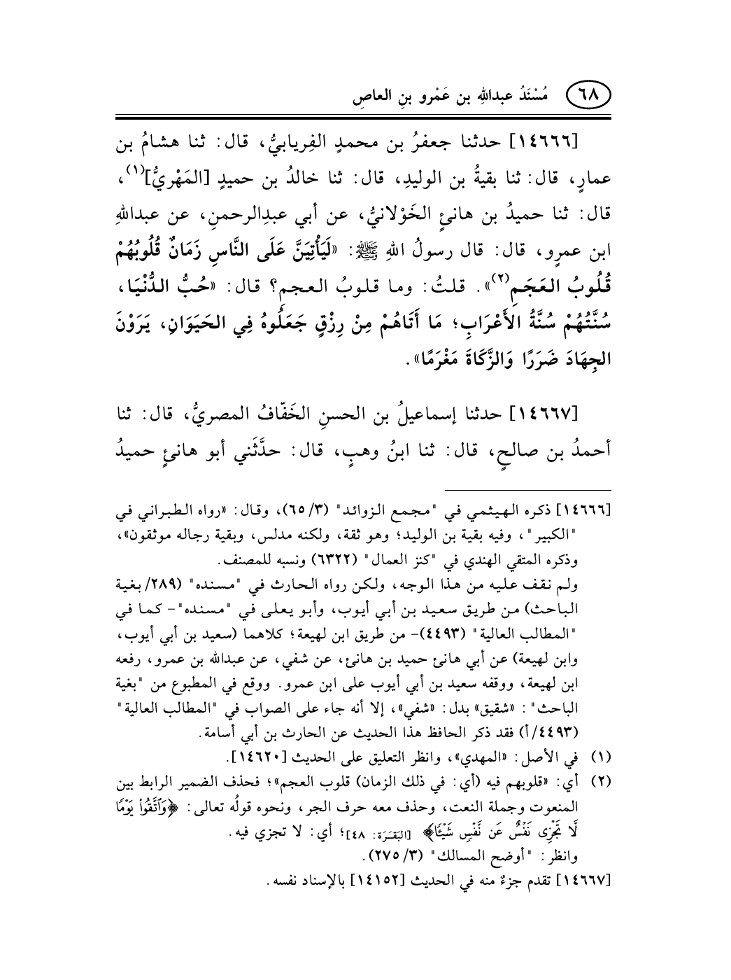 14666 - حدثنا جعفرُ بن محمدٍ الفِريابيُّ، قال: ثنا هشامُ بن عمارٍ، قال: ثنا بقيةُ بن الوليدِ، قال: ثنا خالدُ بن حميدٍ [المَهْريُّ] (¬1) ، قال: ثنا حميدُ بن هانئٍ الخَوْلانيُّ، عن أبي عبدِالرحمنِ، عن عبد اللهِ ابن عمرٍو، قال: قال رسولُ اللهِ صلى الله عليه وسلم: «لَيَأْتِيَنَّ عَلَى النَّاسِ زَمَانٌ قُلُوبُهُمْ قُلُوبُ العَجَمِ (¬2) » . قلتُ: وما قلوبُ العجمِ؟ قال: «حُبُّ الدُّنْيَا، سُنَّتُهُمْ سُنَّةُ الأَعْرَابِ؛ مَا أَتَاهُمْ مِنْ رِزْقٍ جَعَلُوهُ فِي الحَيَوَانِ، يَرَوْنَ الجِهَادَ ضَرَرًا وَالزَّكَاةَ مَغْرَمًا» .
