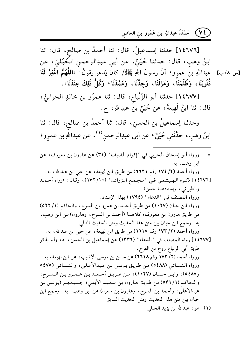 14676 - حدثنا إسماعيلُ، قال: ثنا أحمدُ بن صالحٍ، قال: ثنا ابنُ وهبٍ، قال: حدثنا حُيَيٌّ، عن أبي عبدِالرحمنِ الحُبُليِّ، عن عبد اللهِ بن عمرٍو؛ أنّ رسولَ اللهِ صلى الله عليه وسلم/ كان يَدعو يقولُ: «اللَّهُمَّ اغْفِرْ لَنَا [س: 8/ب] ذُنُوبَنَا، وَظُلْمَنَا، وَهَزْلَنَا، وَجِدَّنَا، وَعَمْدَنَا؛ وَكُلُّ ذَلِكَ عِنْدَنَا» .