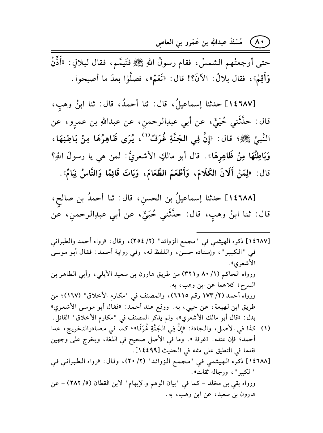 14687 - حدثنا إسماعيلُ، قال: ثنا أحمدُ، قال: ثنا ابنُ وهبٍ، قال: حدَّثَني حُيَيٌّ، عن أبي عبدِالرحمنِ، عن عبد اللهِ بن عمرٍو، عن النَّبيِّ صلى الله عليه وسلم؛ قال: «إِنَّ فِي الجَنَّةِ غُرَفً (¬1) ، يُرَى ظَاهِرُهَا مِنْ بَاطِنِهَا، وَبَاطِنُهَا مِنْ ظَاهِرِهَا» . قال أبو مالكٍ الأشعريُّ: لمن هي يا رسولَ اللهِ؟ قال: «لِمَنْ أَلاَنَ الكَلاَمَ، وَأَطْعَمَ الطَّعَامَ، وَبَاتَ قَائِمًا وَالنَّاسُ نِيَامٌ» .