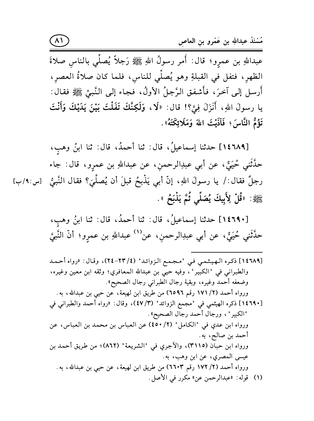 14689 - حدثنا إسماعيلُ، قال: ثنا أحمدُ، قال: ثنا ابنُ وهبٍ، حدَّثَني حُيَيٌّ، عن أبي عبدِالرحمنِ، عن عبد اللهِ بن عمرٍو، قال: جاء رجلٌ فقال: / يا رسولَ اللهِ، إنّ أبي يَذْبحُ قبلَ أن يُصلِّيَ؟ فقال النَّبيُّ [س: 9/ب] صلى الله عليه وسلم: «قُلْ لأَِبِيكَ يُصَلِّي ثُمَّ يَذْبَحُ» .