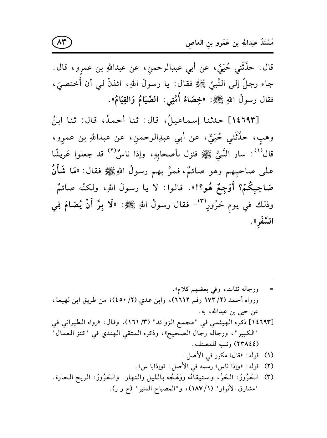 14693 - حدثنا إسماعيلُ، قال: ثنا أحمدُ، قال: ثنا ابنُ وهبٍ، حدَّثَني حُيَيٌّ، عن أبي عبدِالرحمنِ، عن عبد اللهِ بن عمرٍو، قال (¬1) : سار النَّبيُّ صلى الله عليه وسلم فنزل بأصحابِهِ، وإذا ناسٌ (¬2) قد جعلوا عَريشًا على صاحبِهم وهو صائمٌ، فمرَّ بهم رسولُ اللهِ صلى الله عليه وسلم فقال: «مَا شَأْنُ صَاحِبِكُمْ؟ أَوَجِعٌ هُو؟!» . قالوا: لا يا رسولَ اللهِ، ولكنّه صائمٌ- وذلك في يومِ حَرُورٍ (¬3) - فقال رسولُ اللهِ صلى الله عليه وسلم: «لاَ بِرَّ أَنْ يُصَامَ فِي السَّفَرِ» .