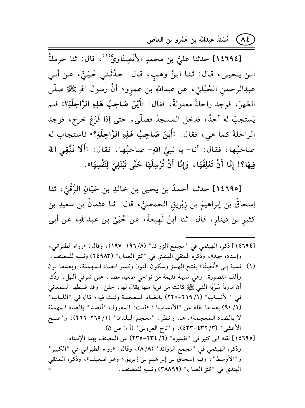 14694 - حدثنا عليُّ بن محمدٍ الأَنْصِنَاويُّ (¬1) ، قال: ثنا حرملةُ ابن يحيى، قال: ثنا ابنُ وهبٍ، قال: حدَّثَني حُيَيٌّ، عن أبي عبدِالرحمنِ الحُبُليِّ، عن عبد اللهِ بن عمرٍو؛ أنَّ رسولَ اللهِ صلى الله عليه وسلم صلّى الظهرَ، فوجد راحلةً معقولةً، فقال: «أَيْنَ صَاحِبُ هَذِهِ الرَّاحِلَةِ؟» فلم يَستجبْ له أحدٌ، فدخل المسجدَ فصلّى، حتى إذا فَرَغ خرج، فوجد الراحلةَ كما هي، فقال: «أَيْنَ صَاحِبُ هَذِهِ الرَّاحِلَةِ؟» فاستجاب له صاحبُها، فقال: أنا- يا نبيَّ اللهِ- صاحبُها. فقال: «أَلاَ تَتَّقِي اللهَ فِيهَا؟! إِمَّا أَنْ تَعْلِفَهَا، وَإِمَّا أَنْ تُرْسِلَهَا حَتَّى تَبْتَغِيَ لِنَفْسِهَا» .