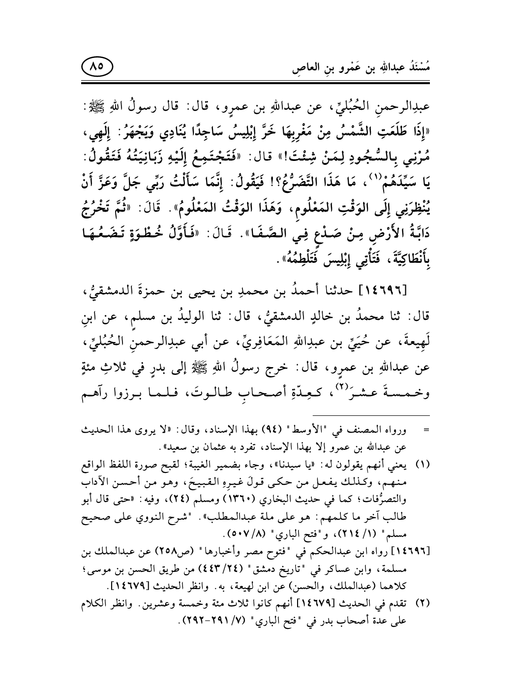 14696 - حدثنا أحمدُ بن محمدِ بن يحيى بن حمزةَ الدمشقيُّ، قال: ثنا محمدُ بن خالدٍ الدمشقيُّ، قال: ثنا الوليدُ بن مسلمٍ، عن ابنِ لَهِيعةَ، عن حُيَيِّ بن عبدِاللهِ المَعَافِريِّ، عن أبي عبدِالرحمنِ الحُبُليِّ، عن عبد اللهِ بن عمرٍو، قال: خرج رسولُ اللهِ صلى الله عليه وسلم إلى بدرٍ في ثلاثِ مئةٍ وخمسةَ عشرَ (¬1) ، كعِدّةِ أصحابِ طالوتَ، فلما برزوا رآهم -[86]- رَجَّالةً (¬2) حفاةً عراةً، فقال: «اللَّهُمَّ إِنَّهُمْ جِيَاعٌ فَأَشْبِعْهُمْ، / وَرَجَّالَةٌ فَاحْمِلْهُمْ، وَعُرَاةٌ فَاكْسُهُمْ» . فرَجَعوا من بدرٍ وما منهم أحدٌ إلا وهو آخذٌ برأسِ جملٍ أو جملين، واكتسَوْا وشَبِعوا.