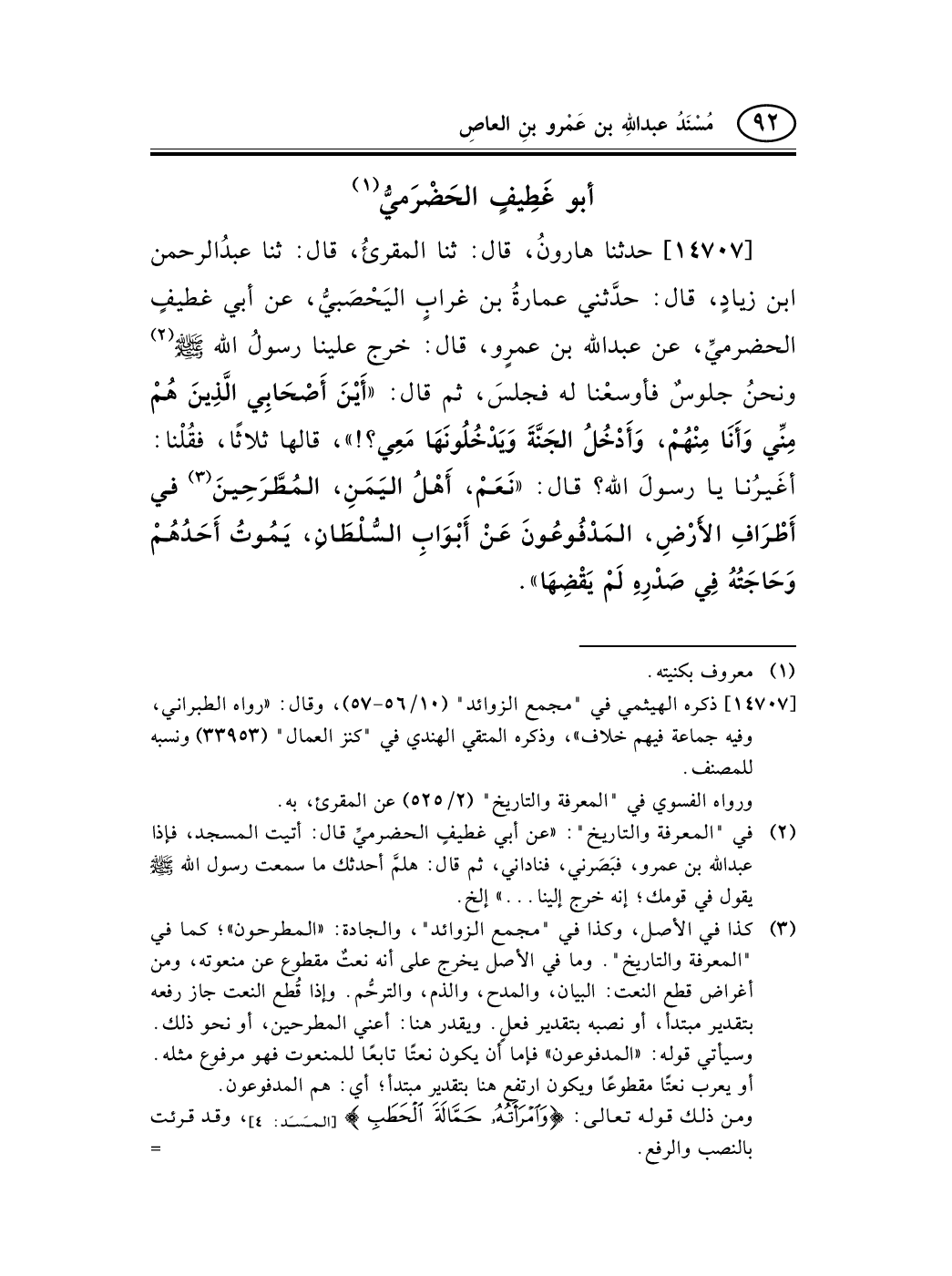14707 - حدثنا هارونُ، قال: ثنا المقرئُ، قال: ثنا عبدُالرحمن ابن زيادٍ، قال: حدَّثني عمارةُ بن غرابٍ اليَحْصَبيُّ، عن أبي غطيفٍ الحضرميِّ، عن عبد الله بن عمرٍو، قال: خرج علينا رسولُ الله صلى الله عليه وسلم (¬2) ونحنُ جلوسٌ فأوسعْنا له فجلسَ، ثم قال: «أَيْنَ أَصْحَابِي الَّذِينَ هُمْ مِنِّي وَأَنَا مِنْهُمْ، وَأَدْخُلُ الجَنَّةَ وَيَدْخُلُونَهَا مَعِي؟!» ، قالها ثلاثًا، فقُلْنا: أغَيرُنا يا رسولَ الله؟ قال: «نَعَمْ، أَهْلُ اليَمَنِ، المُطَّرَحِينَ (¬3) في أَطْرَافِ الأَرْضِ، المَدْفُوعُونَ عَنْ أَبْوَابِ السُّلْطَانِ، يَمُوتُ أَحَدُهُمْ وَحَاجَتُهُ فِي صَدْرِهِ لَمْ يَقْضِهَا» .