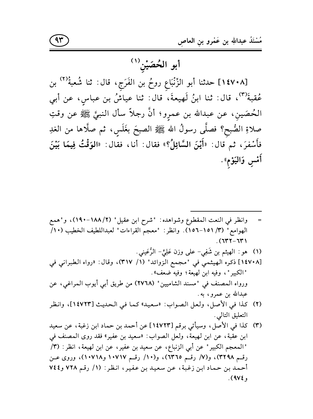 14708 - حدثنا أبو الزِّنْبَاعِ روحُ بن الفَرَجِ، قال: ثنا شُعبةُ (¬2) بن عُقبةَ (¬3) ، قال: ثنا ابنُ لَهيعةَ، قال: ثنا عياشُ بن عباسٍ، عن أبي الحُصَينِ، عن عبد الله بن عمرٍو؛ أنَّ رجلاً سأل النبيَّ صلى الله عليه وسلم عن وقتِ صلاةِ الصُّبحِ؟ فصلَّى رسولُ الله صلى الله عليه وسلم الصبحَ بغَلَسٍ، ثم صلاَّها من الغدِ فأَسْفرَ، ثم قال: «أَيْنَ السَّائِلُ؟» فقال: أنا، فقال: «الوَقْتُ فِيمَا بَيْنَ أَمْسِ وَاليَوْمِ» .