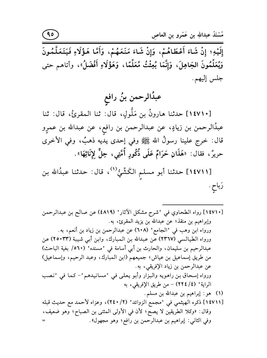 14710 - حدثنا هارونُ بن مَلُّولٍ، قال: ثنا المقرئُ، قال: ثنا عبدُالرحمن بن زيادٍ، عن عبد الرحمن بن رافعٍ، عن عبد الله بن عمرٍو قال: خرج علينا رسولُ الله صلى الله عليه وسلم وفي إحدى يديه ذهبٌ، وفي الأخرى حريرٌ، فقال: «هَذَانِ حَرَامٌ عَلَى ذُكُورِ أُمَّتِي، حِلٌّ لِإِنَاثِهَا» .