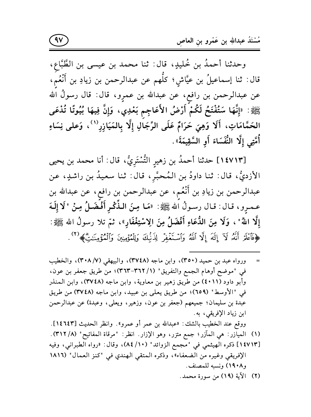 14713 - حدثنا أحمدُ بن زهيرٍ التُّسْتَرِيُّ، قال: أنا محمد بن يحيى الأزديُّ، قال: ثنا داودُ بن المُحبَّرِ، قال: ثنا سعيدُ بن راشدٍ، عن عبد الرحمن بن زيادِ بن أَنْعُمٍ، عن عبد الرحمن بن رافعٍ، عن عبد الله بن عمرٍو، قال: قال رسولُ الله صلى الله عليه وسلم: «مَا مِنَ الذِّكْرِ أَفْضَلُ مِنْ "لاَ إِلَهَ إِلاَّ اللهُ"، وَلاَ مِنَ الدُّعَاءِ أَفْضَلُ مِنَ الاِسْتِغْفَارِ» ، ثمّ تلا رسولُ الله صلى الله عليه وسلم: {فَاعْلَمْ أَنَّهُ لاَ إِلهَ إِلاَّ اللَّهُ وَاسْتَغْفِرْ لِذَنْبِكَ وَلِلْمُؤْمِنِينَ وَالْمُؤْمِنَاتِ} (¬1) .