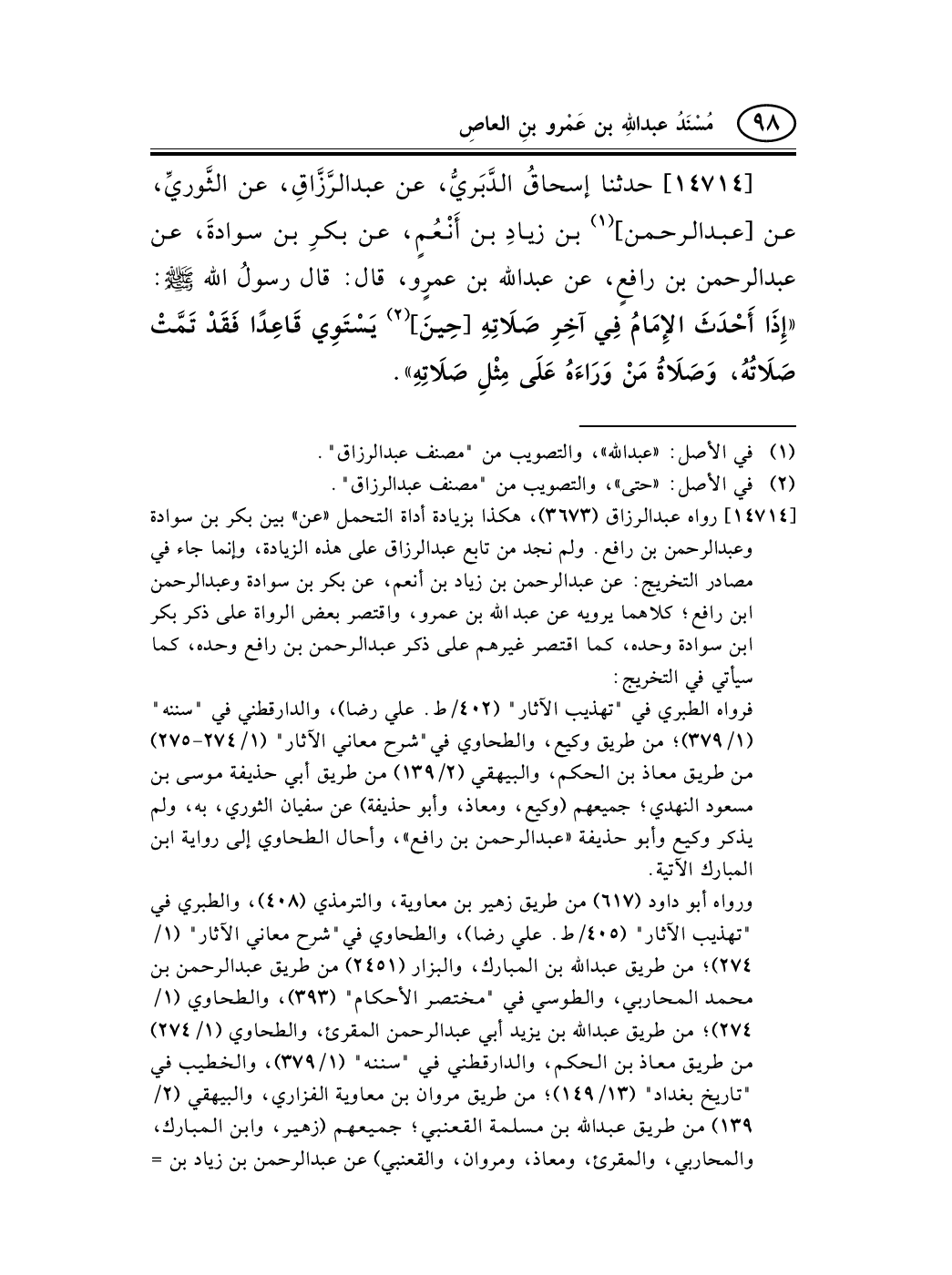 14714 - حدثنا إسحاقُ الدَّبَريُّ، عن عبد الرَّزَّاقِ، عن الثَّوريِّ، عن [عبد الرحمن] (¬1) بن زيادِ بن أَنْعُمٍ، عن بكرِ بن سوادةَ، عن عبد الرحمن بن رافعٍ، عن عبد الله بن عمرٍو، قال: قال رسولُ الله صلى الله عليه وسلم: «إِذَا أَحْدَثَ الإِمَامُ فِي آخِرِ صَلاَتِهِ [حِينَ] (¬2) يَسْتَوِي قَاعِدًا فَقَدْ تَمَّتْ صَلاَتُهُ، وَصَلاَةُ مَنْ وَرَاءَهُ عَلَى مِثْلِ صَلاَتِهِ» .