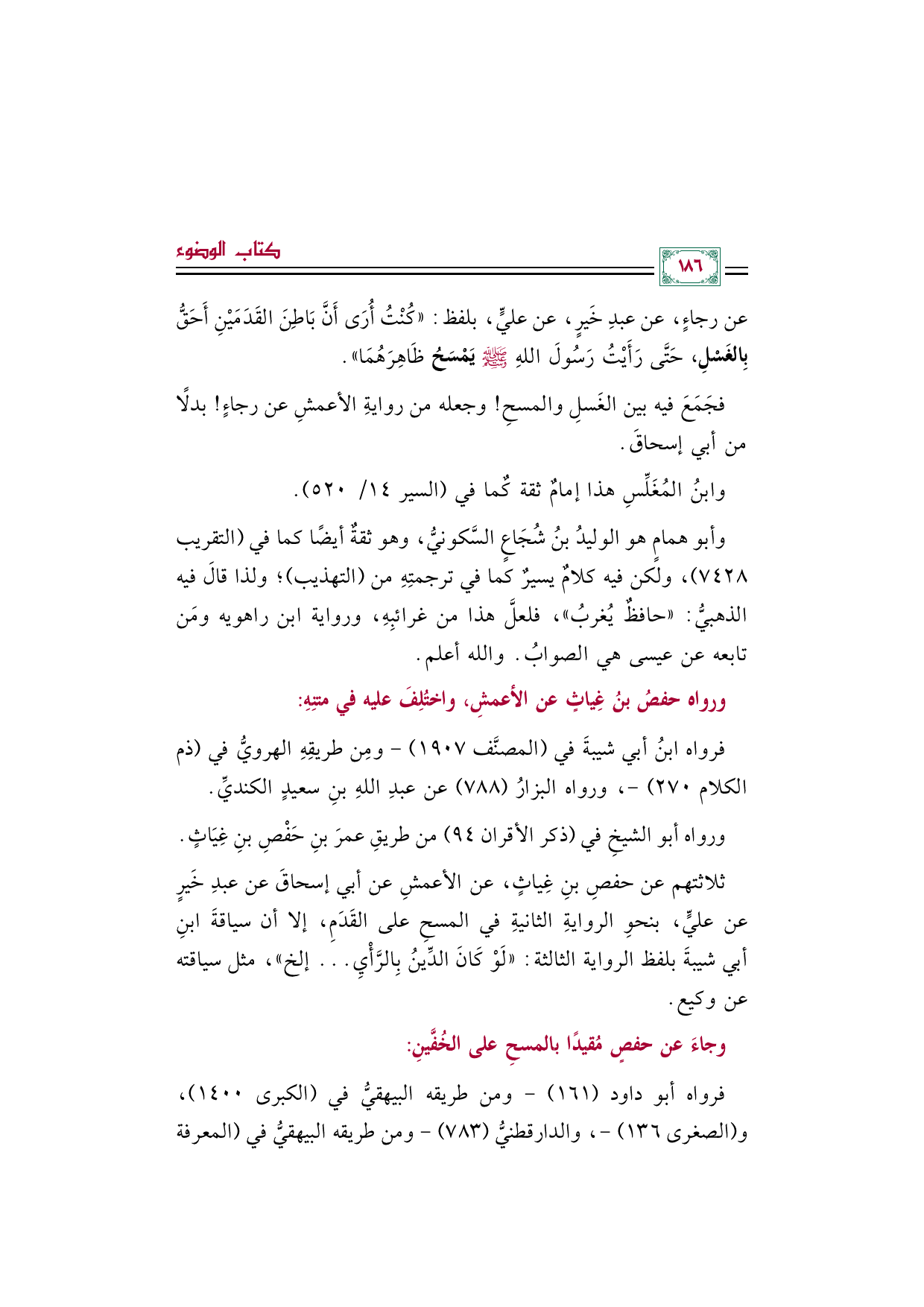 عن رجاءٍ، عن عبدِ خَيرٍ، عن عليٍّ، بلفظ: ((كُنْتُ أُرَى أَنَّ بَاطِنَ القَدَمَيْنِ أَحَقُّ بِالغَسْلِ، حَتَّى رَأَيْتُ رَسُولَ اللهِ صلى الله عليه وسلم يَمْسَحُ ظَاهِرَهُمَا)).