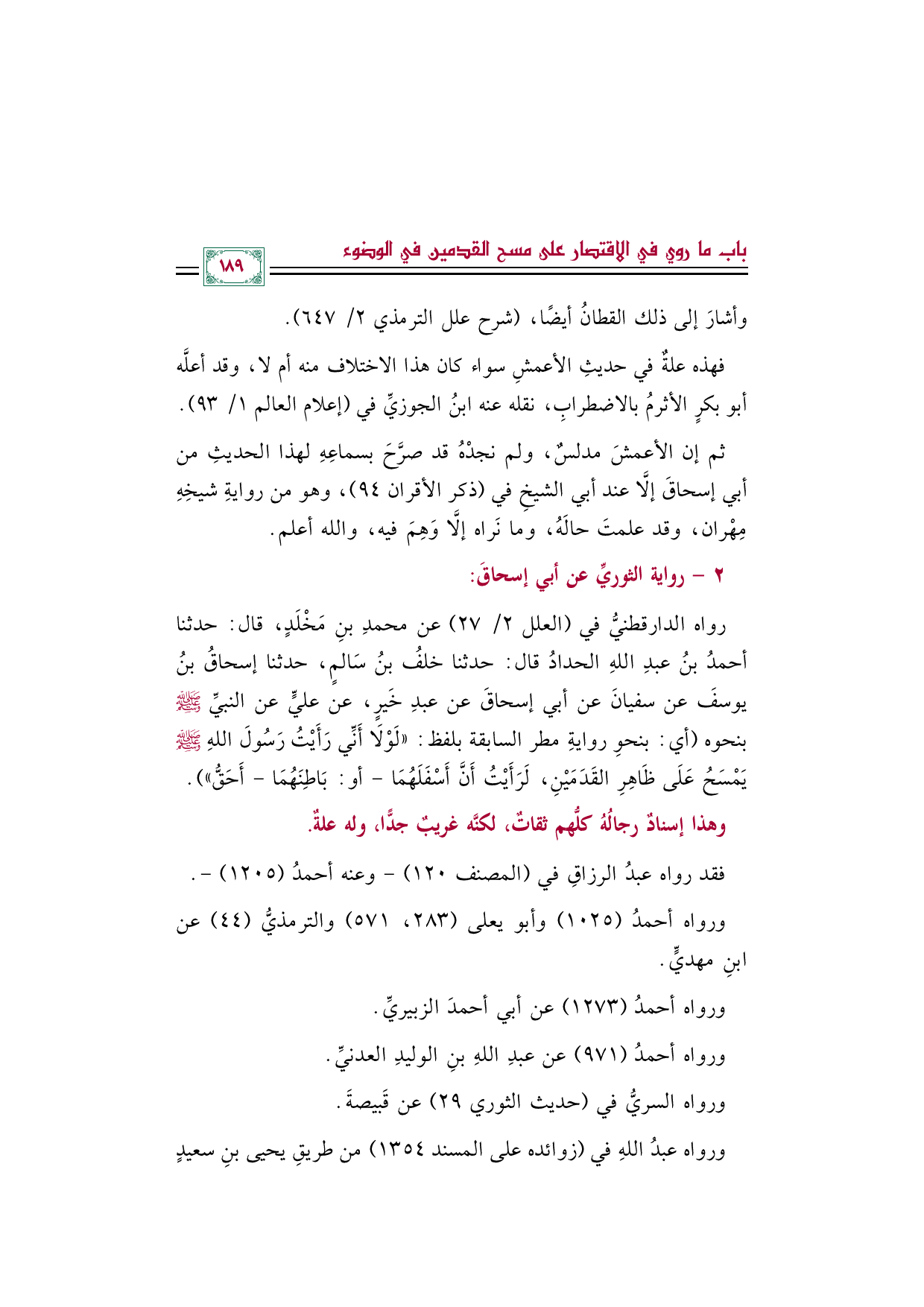 رواه الدارقطنيُّ في (العلل ٢/ ٢٧) عن محمدِ بنِ مَخْلَدٍ، قال: حدثنا أحمدُ بنُ عبدِ اللهِ الحدادُ قال: حدثنا خلفُ بنُ سَالمٍ، حدثنا إسحاقُ بنُ يوسفَ عن سفيانَ عن أبي إسحاقَ عن عبدِ خَيرٍ، عن عليٍّ عن النبيِّ صلى الله عليه وسلم بنحوه (أي: بنحوِ روايةِ مطر السابقة بلفظ: ((لَوْلَا أَنِّي رَأَيْتُ رَسُولَ اللهِ صلى الله عليه وسلم يَمْسَحُ عَلَى ظَاهِرِ القَدَمَيْنِ، لَرَأَيْتُ أَنَّ أَسْفَلَهُمَا -أو: بَاطِنَهُمَا- أَحَقُّ))).