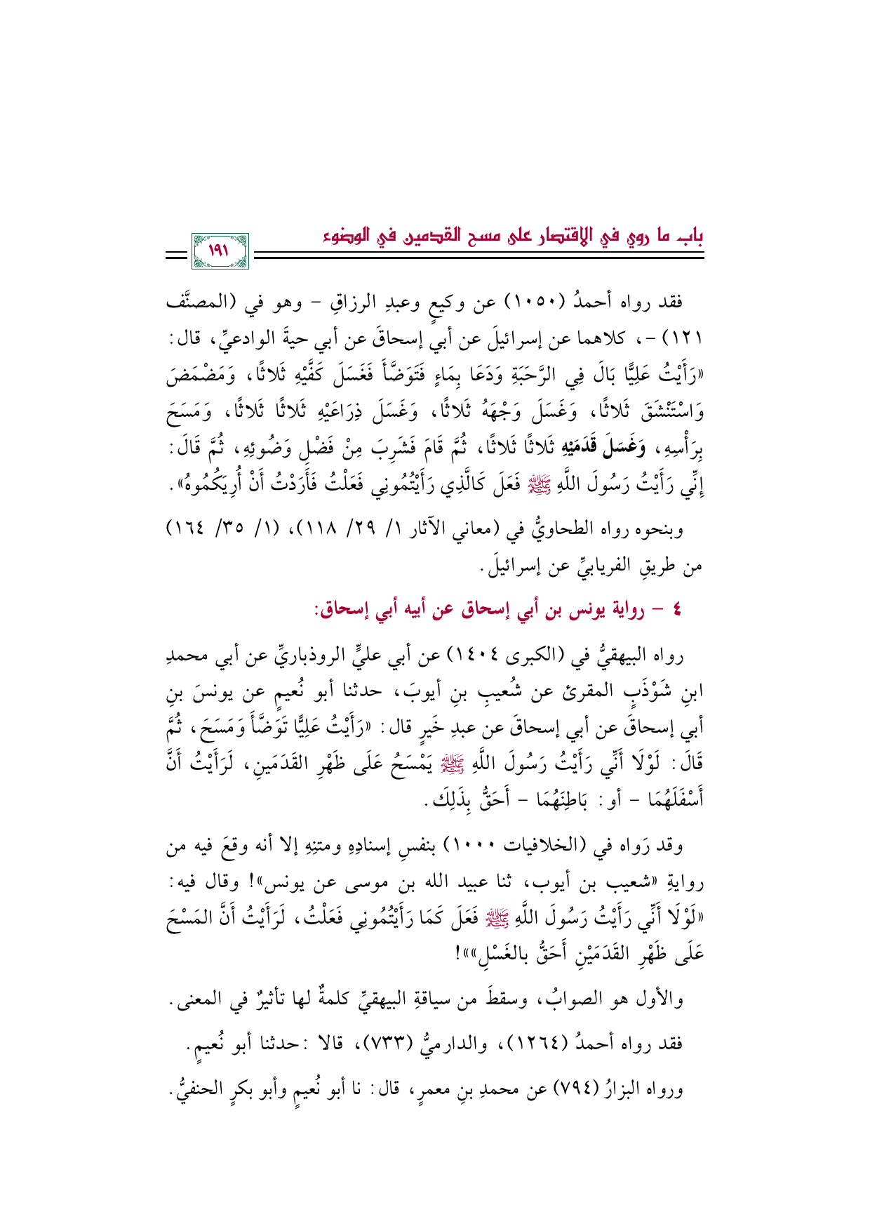رواه البيهقيُّ في (الكبرى ١٤٠٤) عن أبي عليٍّ الروذباريِّ عن أبي محمدِ بنِ شَوْذَبٍ المقرئ عن شُعيبِ بنِ أيوبَ، حدثنا أبو نُعيمٍ عن يونسَ بنِ أبي إسحاقَ عن أبي إسحاقَ عن عبدِ خَيرٍ قال: ((رَأَيْتُ عَلِيًّا تَوَضَّأَ وَمَسَحَ، ثُمَّ قَالَ: لَوْلَا أَنِّي رَأَيْتُ رَسُولَ اللَّهِ صلى الله عليه وسلم يَمْسَحُ عَلَى ظَهْرِ القَدَمَينِ، لَرَأَيْتُ أَنَّ أَسْفَلَهُمَا -أو: بَاطِنَهُمَا- أَحَقُّ بِذَلِكَ.