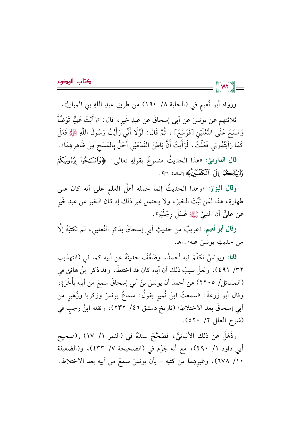ثلاثتهم عن يونسَ عن أبي إسحاقَ عن عبدِ خَيرٍ، قال: ((رَأَيْتُ عَلِيًّا تَوَضَّأَ وَمَسَحَ عَلَى النَّعْلَيْنِ [فَوَسَّعَ]، ثُمَّ قَالَ: لَوْلَا أَنِّي رَأَيْتُ رَسُولَ اللَّهِ صلى الله عليه وسلم فَعَلَ كَمَا رَأَيْتُمُونِي فَعَلْتُ، لَرَأَيْتُ أَنَّ بَاطِنَ القَدَمَيْنِ أَحَقُّ بِالمَسْحِ مِنْ ظَاهِرِهِمَا)).
