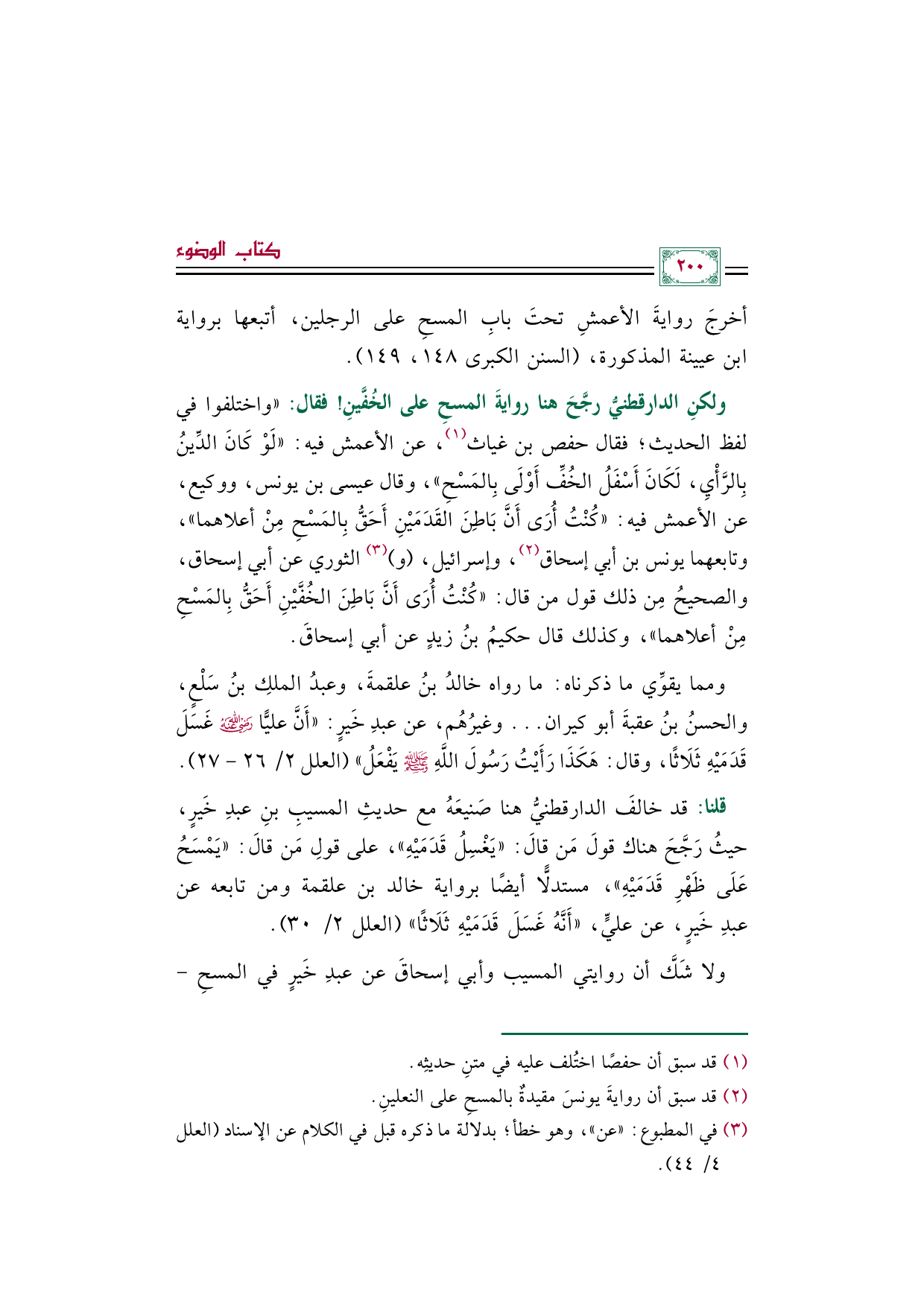 ولكنِ الدارقطنيُّ رجَّحَ هنا روايةَ المسحِ على الخُفَّينِ! فقال: "واختلفوا في لفظ الحديث؛ فقال حفص بن غياث (¬١)، عن الأعمش فيه: ((لَوْ كَانَ الدِّينُ بِالرَّأْيِ، لَكَانَ أَسْفَلُ الخُفِّ أَوْلَى بِالمَسْحِ))، وقال عيسى بن يونس، ووكيع، عن الأعمش فيه: ((كُنْتُ أُرَى أَنَّ بَاطِنَ القَدَمَيْنِ أَحَقُّ بِالمَسْحِ مِنْ أعلاهما"، وتابعهما يونس بن أبي إسحاق (¬٢)، وإسرائيل، (و) (¬٣) الثوري، عن أبي إسحاق، والصحيحُ مِن ذلك قول من قال: ((كُنْتُ أُرَى أَنَّ بَاطِنَ الخُفَّيْنِ أَحَقُّ بِالمَسْحِ مِنْ أعلاهما))، وكذلك قال حكيمُ بنُ زيدٍ عن أبي إسحاقَ.