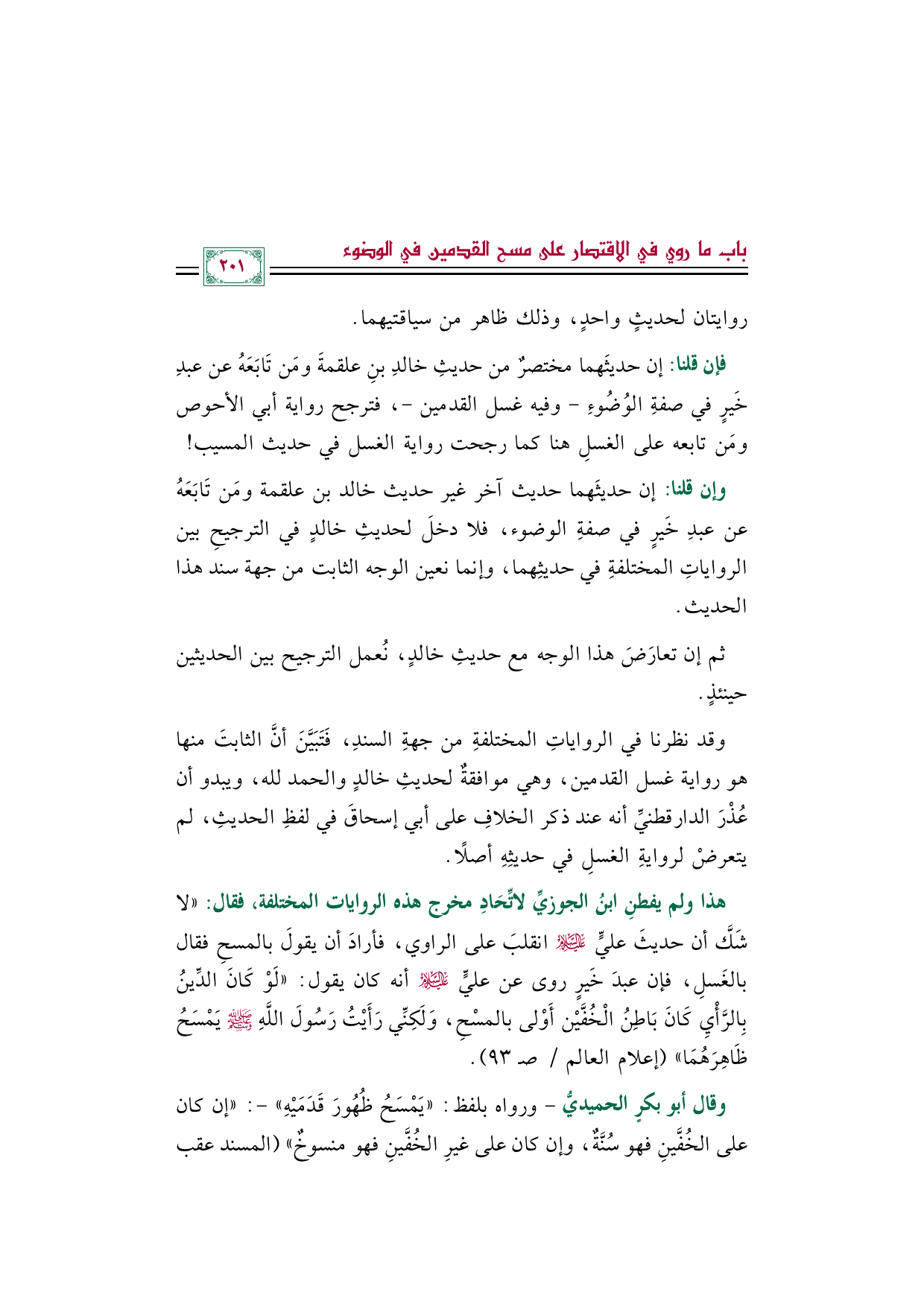 هذا ولم يفطنِ ابنُ الجوزيِّ لاتِّحَادِ مخرج هذه الروايات المختلفة، فقال: "لا شَكَّ أن حديثَ عليٍّ عليه السلام انقلبَ على الراوي، فأرادَ أن يقولَ بالمسحِ فقال بالغَسلِ، فإن عبدَ خَيرٍ روى عن عليٍّ عليه السلام أنه كان يقول: ((لَوْ كَانَ الدِّينُ بِالرَّأْيِ كَانَ بَاطِنُ الْخُفَّيْن أَوْلى بالمسْحِ، وَلَكِنِّي رَأَيْتُ رَسُولَ اللَّهِ صلى الله عليه وسلم يَمْسَحُ ظَاهِرَهُمَا)) (إعلام العالم/ صـ ٩٣).
