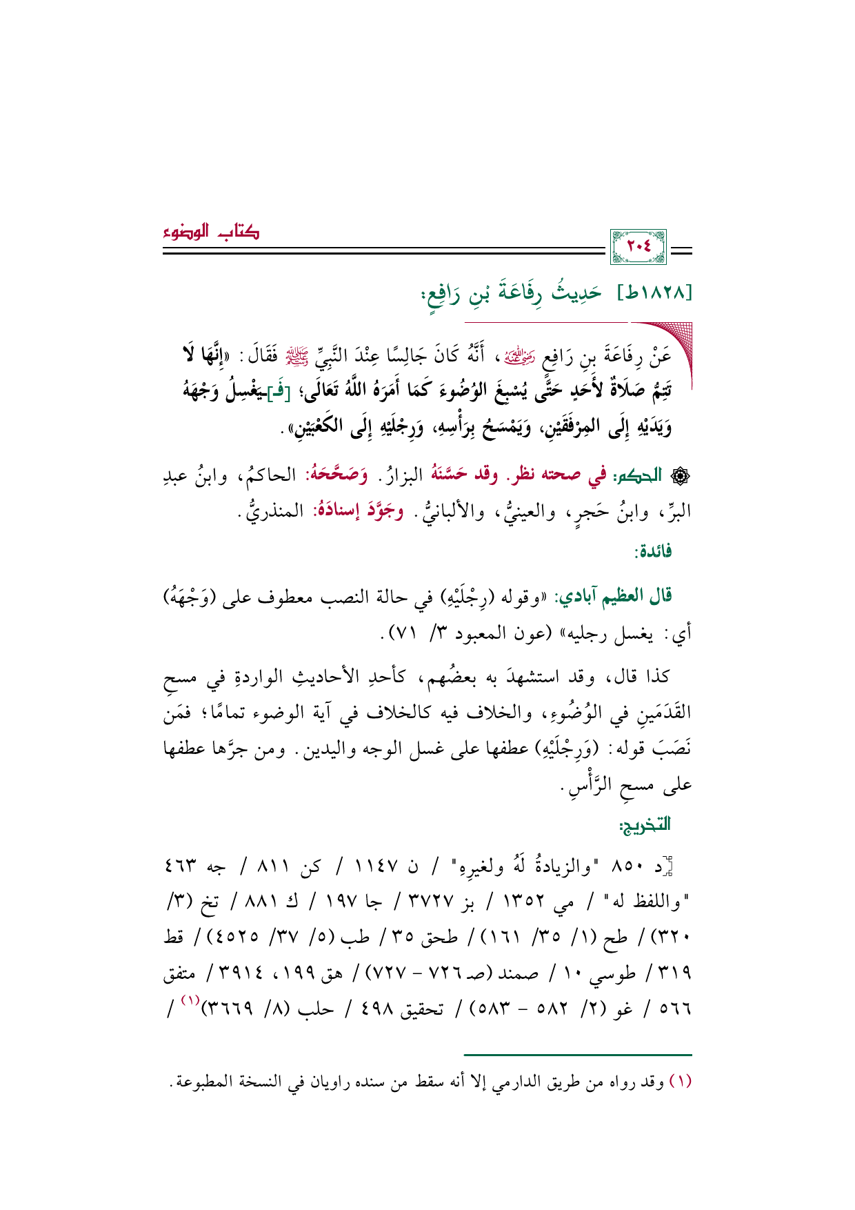 كذا قال، وقد استشهدَ به بعضُهم، كأحدِ الأحاديثِ الواردةِ في مسحِ القَدَمَينِ في الوُضُوءِ، والخلاف فيه كالخلاف في آية الوضوء تمامًا؛ فمَن نَصَبَ قوله: (وَرِجْلَيْهِ) عطفها على غسل الوجه واليدين. ومن جرَّها عطفها على مسحِ الرَّأْسِ.