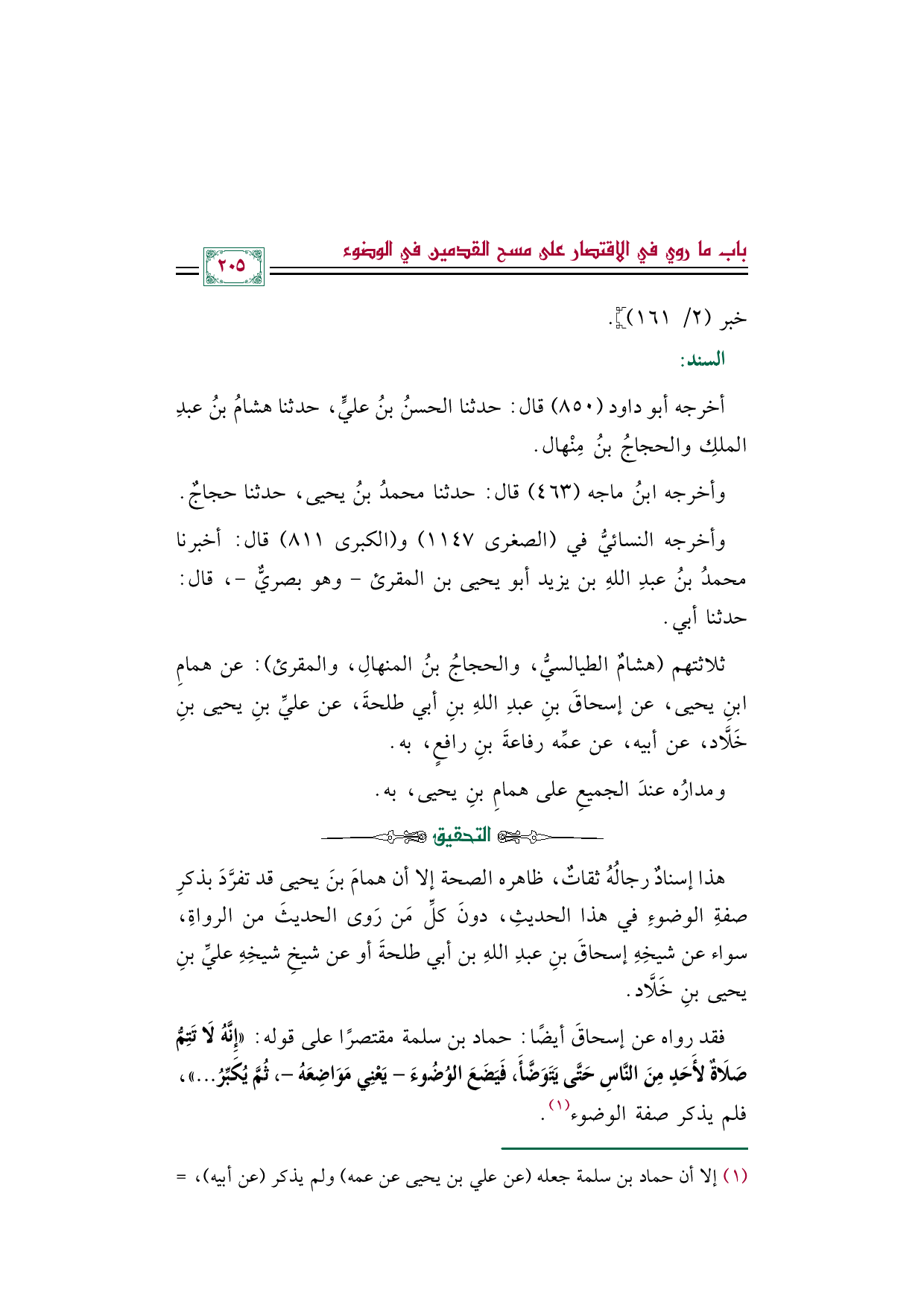 (¬١) إلا أن حماد بن سلمة جعله (عن علي بن يحيى عن عمه) ولم يذكر (عن أبيه)، وتابعه محمد بن عمرو وشريك بن أبي نمر على هذا الوجه، إلا أن الصواب في الحديث بإثبات (أبيه)؛ كما رواه الجماعة عن علي بن يحيى، ورجحه عدد من الأئمة.