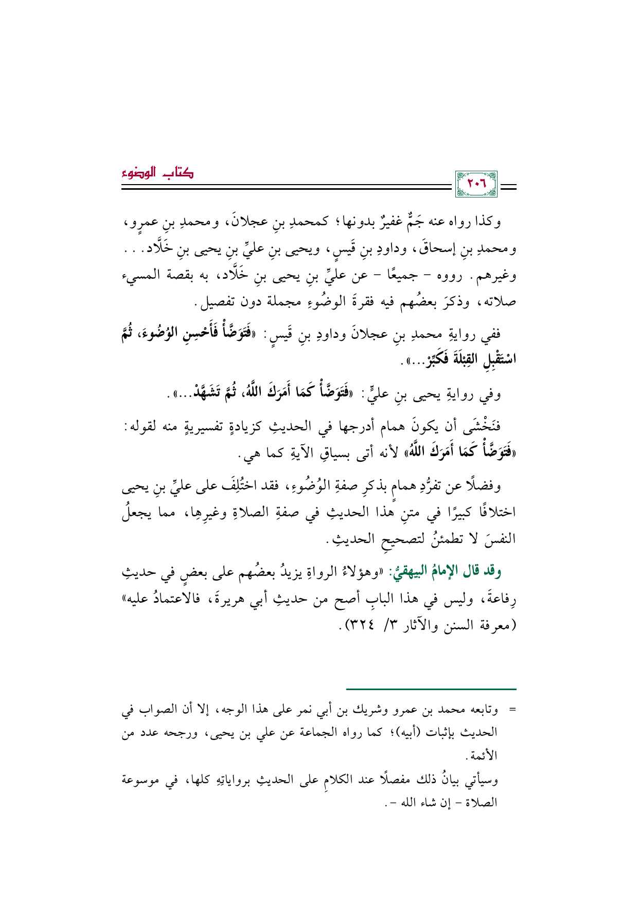 فنَخْشَى أن يكونَ همام أدرجها في الحديثِ كزيادةٍ تفسيريةٍ منه لقوله: «فَتَوَضَّأْ كَمَا أَمَرَكَ اللَّهُ» لأنه أتى بسياقِ الآيةِ كما هي.