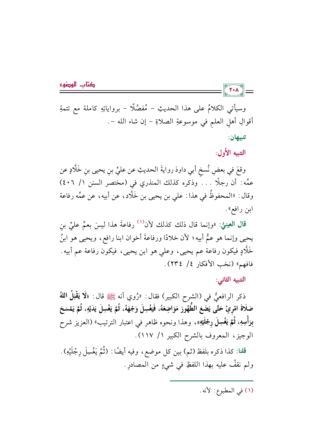 ذكر الرافعيُّ في (الشرح الكبير) فقال: "رُوي أنه صلى الله عليه وسلم قال: ((لَا يَقْبَلُ اللهُ صَلَاةَ امْرِئٍ حَتَّى يَضَعَ الطُّهُورَ مَوَاضِعَهُ، فَيَغْسِلَ وَجْهَهُ، ثُمَّ يَغْسِلَ يَدَيْهِ، ثُمَّ يَمْسَحَ بِرَأْسِهِ، ثُمَّ يَغْسِلَ رِجْلَيْهِ))، وهذا ونحوه ظاهر في اعتبار الترتيب" (العزيز شرح الوجيز، المعروف بالشرح الكبير ١/ ١١٧).