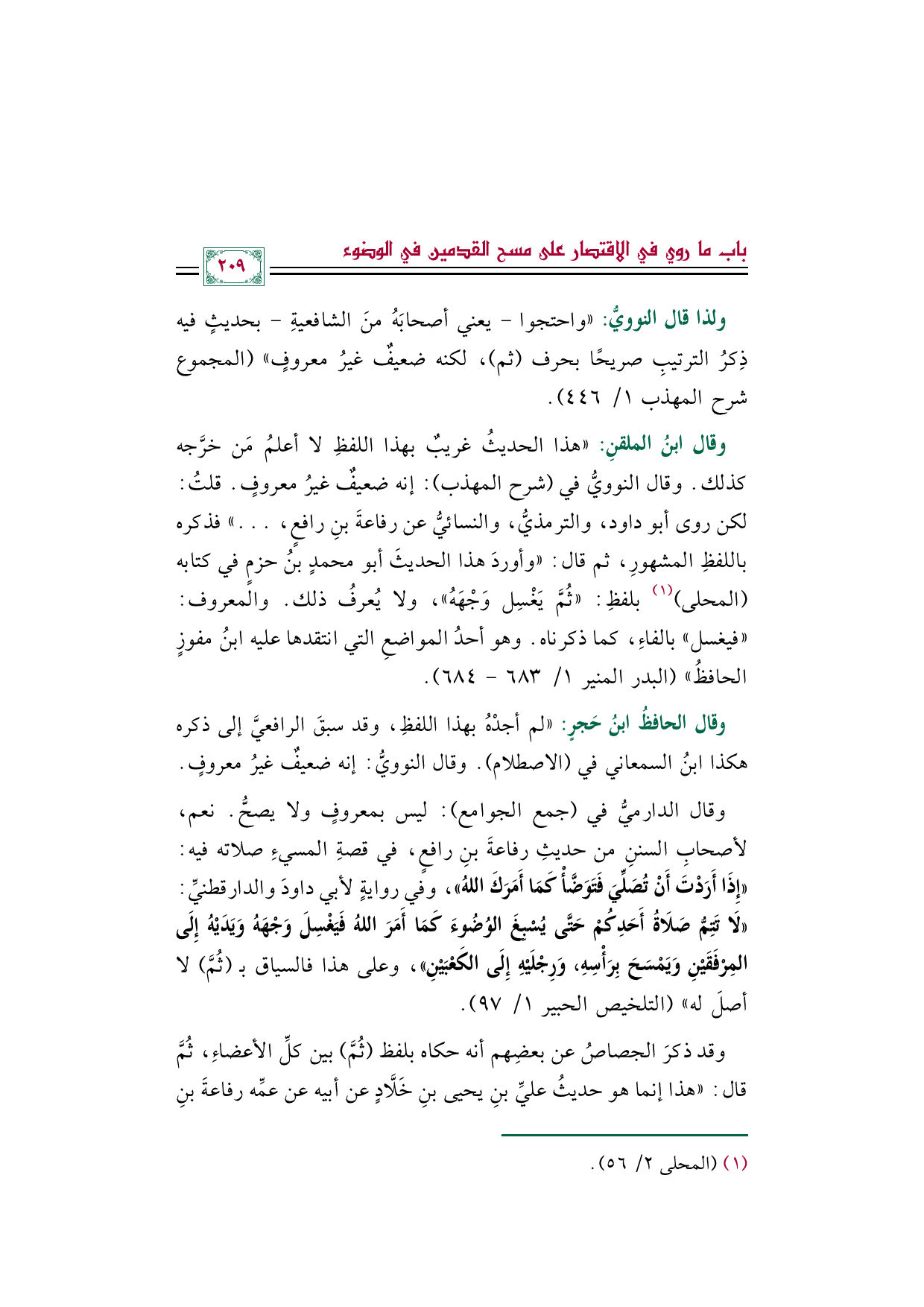 وقال ابنُ الملقنِ: "هذا الحديثُ غريبٌ بهذا اللفظِ لا أعلمُ مَن خرَّجه كذلك. وقال النوويُّ في (شرح المهذب): إنه ضعيفٌ غيرُ معروفٍ. قلتُ: لكن روى أبو داود، والترمذيُّ، والنسائيُّ عن رفاعةَ بنِ رافعٍ، ... " فذكره باللفظِ المشهورِ، ثم قال: "وأوردَ هذا الحديثَ أبو محمدٍ بنُ حزمٍ في كتابه (المحلى) (¬١) بلفظِ: ((ثُمَّ يَغْسِل وَجْهَهُ))، ولا يُعرفُ ذلك. والمعروف: «فيغسل» بالفاءِ، كما ذكرناه. وهو أحدُ المواضعِ التي انتقدها عليه ابنُ مفوزٍ الحافظُ" (البدر المنير ١/ ٦٨٣ - ٦٨٤).