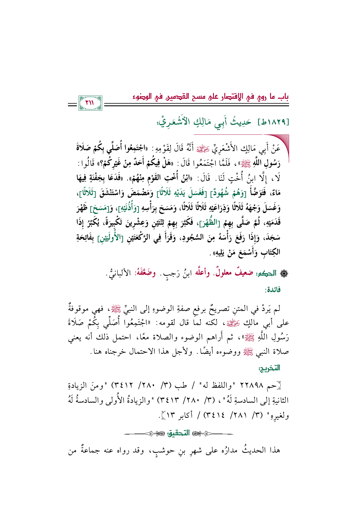 لم يَردْ في المتنِ تصريحٌ برفعِ صفةِ الوضوءِ إلى النبيِّ صلى الله عليه وسلم، فهي موقوفةٌ على أبي مالكٍ رضي الله عنه، لكنه لما قال لقومه: ((اجْتَمِعُوا أُصَلِّي بِكُمْ صَلَاةَ رَسُولِ اللَّهِ صلى الله عليه وسلم))، ثم أَراهم الوضوء والصلاة معًا، احتمل ذلك أنه يعني صلاة النبي صلى الله عليه وسلم ووضوءه أيضًا. ولأجل هذا الاحتمال خرجناه هنا.