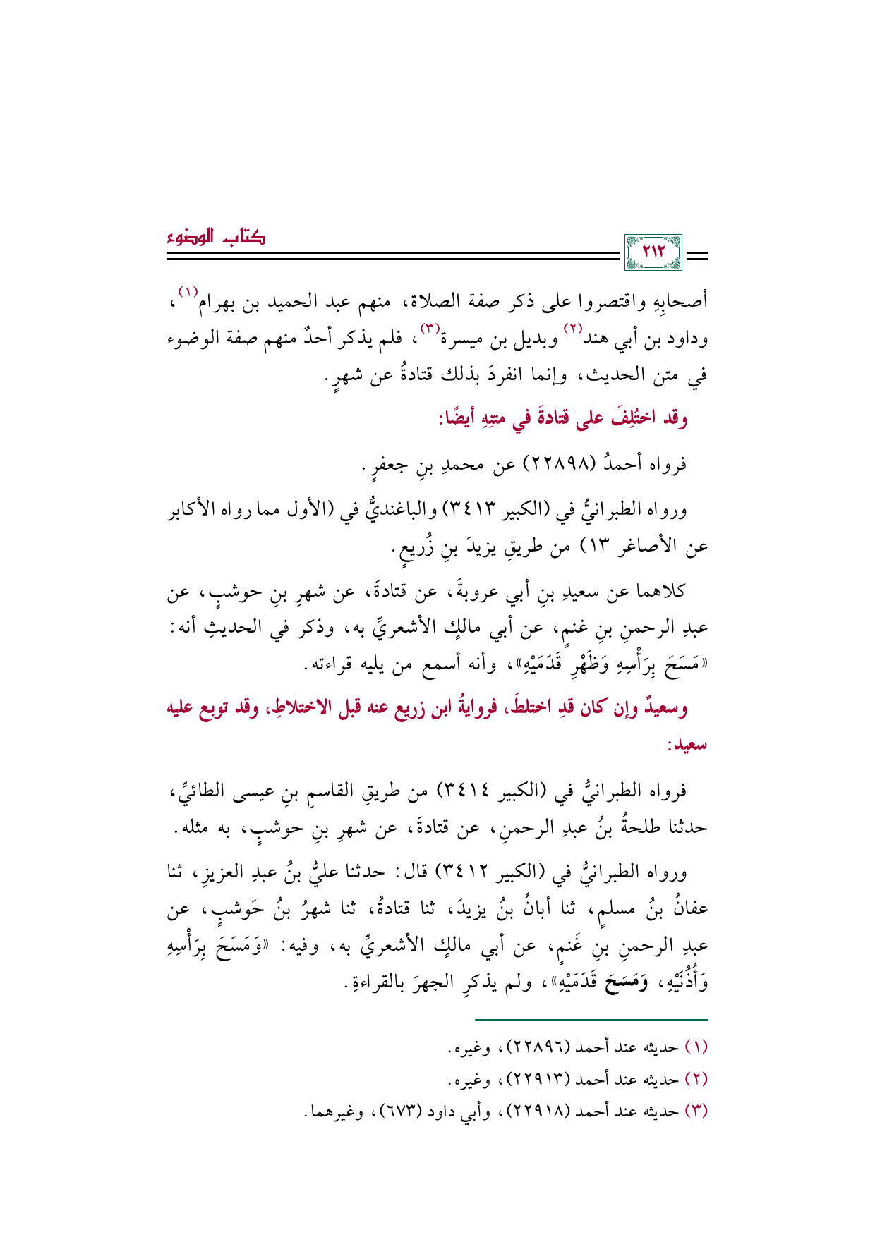 أصحابِهِ واقتصروا على ذكر صفة الصلاة، منهم عبد الحميد بن بهرام (¬١)، وداود بن أبي هند (¬٢) وبديل بن ميسرة (¬٣)، فلم يذكر أحدٌ منهم صفة الوضوء في متن الحديث، وإنما انفردَ بذلك قتادةُ عن شهرٍ.