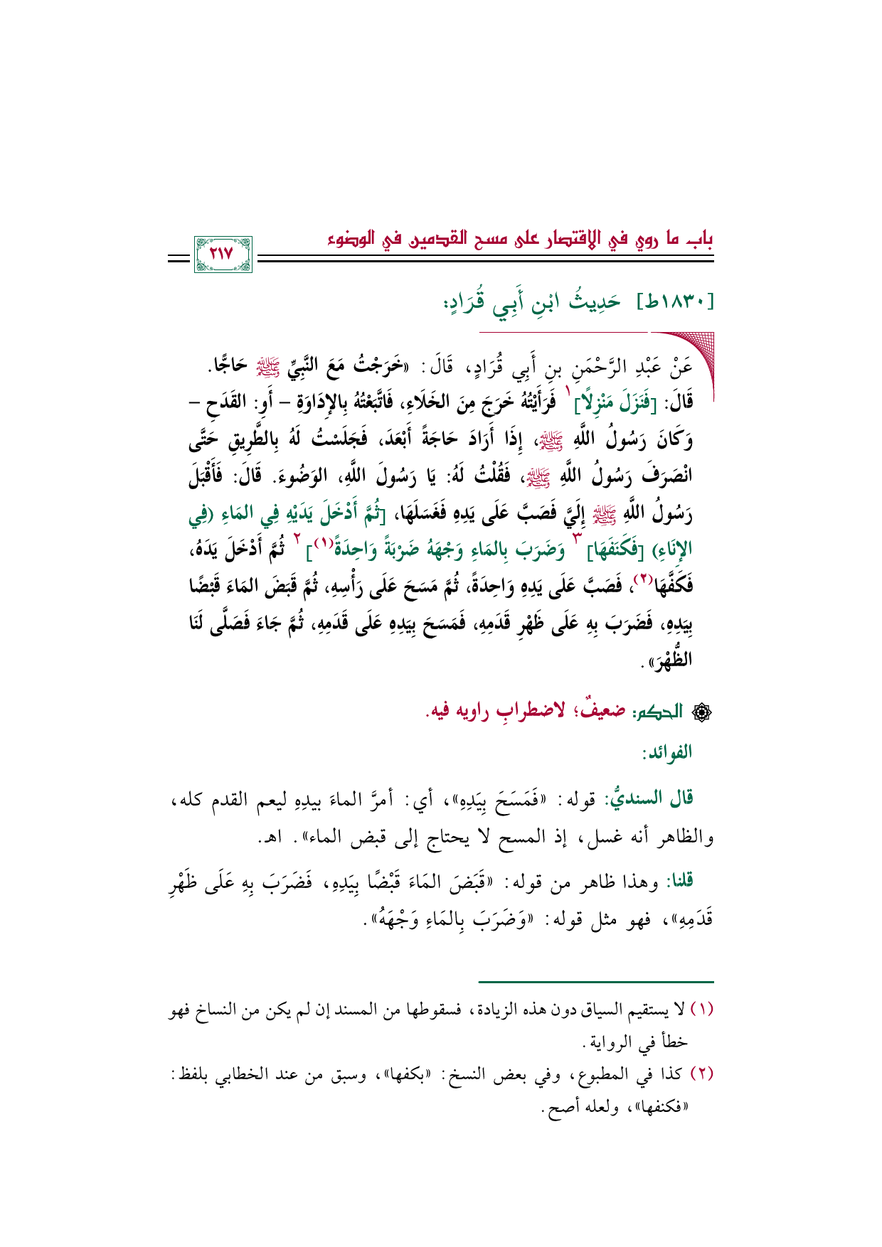 قَالَ: [فَنَزَلَ مَنْزِلًا] ١ فَرَأَيْتُهُ خَرَجَ مِنَ الخَلَاءِ، فَاتَّبَعْتُهُ بِالإِدَاوَةِ -أَوِ: القَدَحِ- وَكَانَ رَسُولُ اللَّهِ صلى الله عليه وسلم، إِذَا أَرَادَ حَاجَةً أَبْعَدَ، فَجَلَسْتُ لَهُ بِالطَّرِيقِ حَتَّى انْصَرَفَ رَسُولُ اللَّهِ صلى الله عليه وسلم، فَقُلْتُ لَهُ: يَا رَسُولَ اللَّهِ، الوَضُوءَ. قَالَ: فَأَقْبَلَ رَسُولُ اللَّهِ صلى الله عليه وسلم إِلَيَّ فَصَبَّ عَلَى يَدِهِ فَغَسَلَهَا، [ثُمَّ أَدْخَلَ يَدَيْهِ فِي المَاءِ (فِي الإِنَاءِ) [فَكَنَفَهَا] ٣ وَضَرَبَ بِالمَاءِ وَجْهَهُ ضَرْبَةً وَاحِدَةً (¬١)] ٢ ثُمَّ أَدْخَلَ يَدَهُ، فَكَفَّهَا (¬٢)، فَصَبَّ عَلَى يَدِهِ وَاحِدَةً، ثُمَّ مَسَحَ عَلَى رَأْسِهِ، ثُمَّ قَبَضَ المَاءَ قَبْضًا بِيَدِهِ، فَضَرَبَ بِهِ عَلَى ظَهْرِ قَدَمِهِ، فَمَسَحَ بِيَدِهِ عَلَى قَدَمِهِ، ثُمَّ جَاءَ فَصَلَّى لَنَا الظُّهْرَ)).
