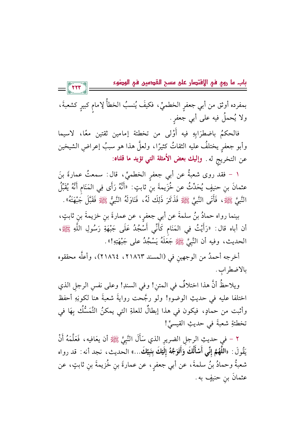 ٢ - في حديثِ الرجلِ الضريرِ الذي سَأَلَ النَّبِيَّ صلى الله عليه وسلم أن يعَافيه، فَعَلَّمَهُ أَنْ يَقُولَ: ((اللَّهُمَّ إِنِّي أَسْأَلُكَ وَأَتَوَجَّهُ إِلَيْكَ بِنَبِيِّكَ ... )) الحديث، نجد أنه: قد رواه شعبةُ وحمادُ بنُ سلمةَ، عن أبي جعفرٍ، عن عمارةَ بنِ خُزيمةَ بنِ ثابتٍ، عن عثمانَ بنِ حنيفٍ به.