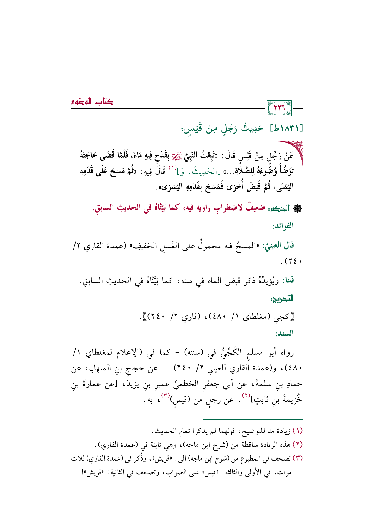 (¬٣) تصحف في المطبوع من (شرح ابن ماجه) إلى: "قريش"، وذُكر في (عمدة القاري) ثلاث مرات، في الأولى والثالثة: "قيس" على الصواب، وتصحف في الثانية: "قريش"!