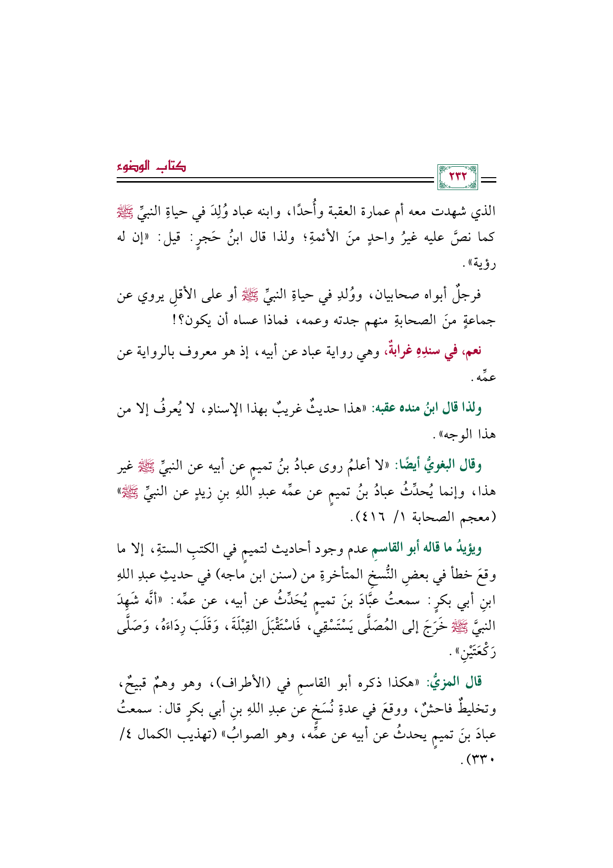 وقال البغويُّ أيضًا: "لا أعلمُ روى عبادُ بنُ تميمٍ عن أبيه عن النبيِّ صلى الله عليه وسلم غير هذا، وإنما يُحدِّثُ عبادُ بنُ تميمٍ عن عمِّه عبدِ اللهِ بنِ زيدٍ عن النبيِّ صلى الله عليه وسلم" (معجم الصحابة ١/ ٤١٦).