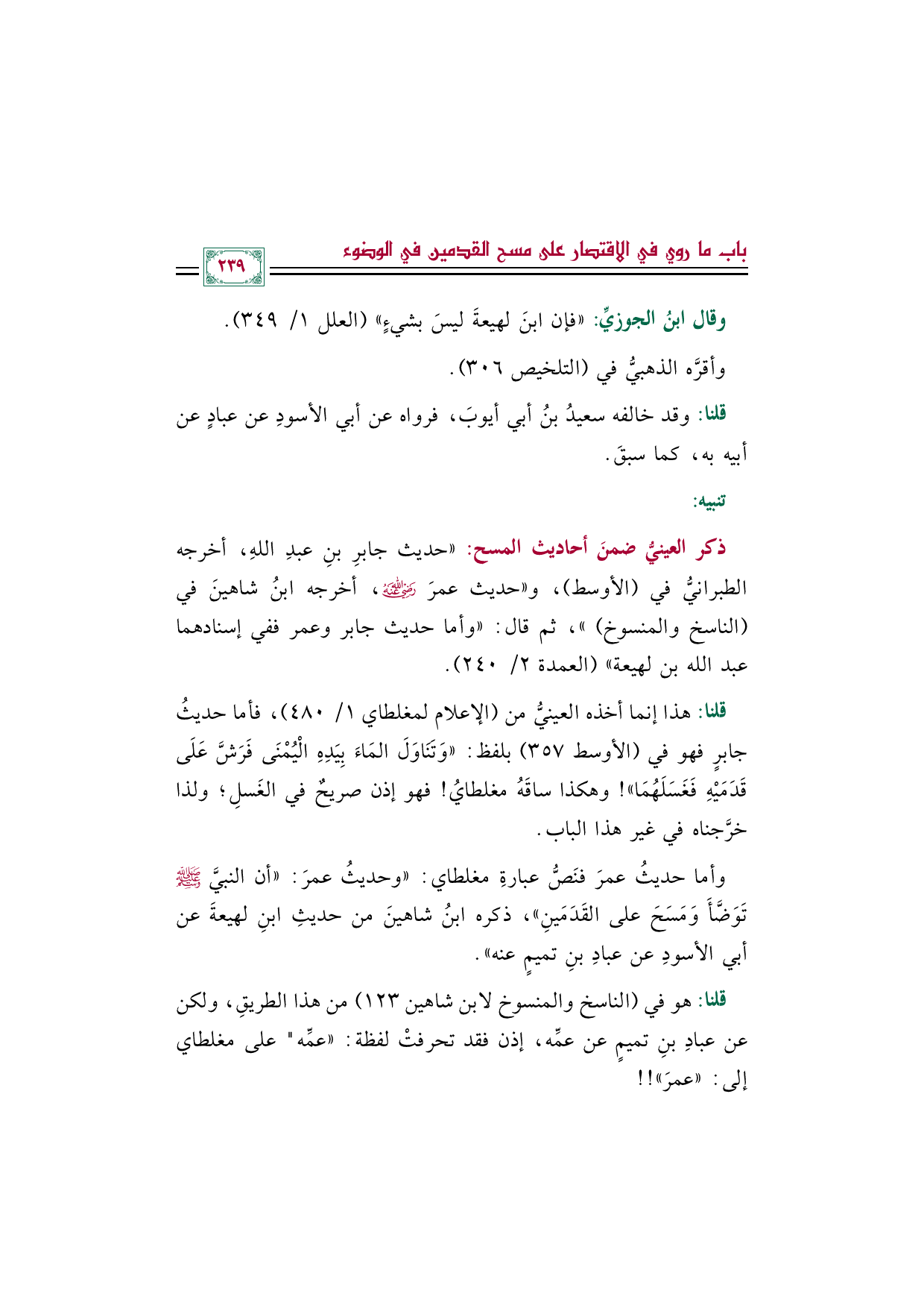 ذكر العينيُّ ضمنَ أحاديث المسح: "حديث جابرِ بنِ عبدِ اللهِ، أخرجه الطبرانيُّ في (الأوسط)، و"حديث عمرَ رضي الله عنه، أخرجه ابنُ شاهينَ في (الناسخ والمنسوخ) "، ثم قال: "وأما حديث جابر وعمر ففي إسنادهما عبد الله بن لهيعة" (العمدة ٢/ ٢٤٠).