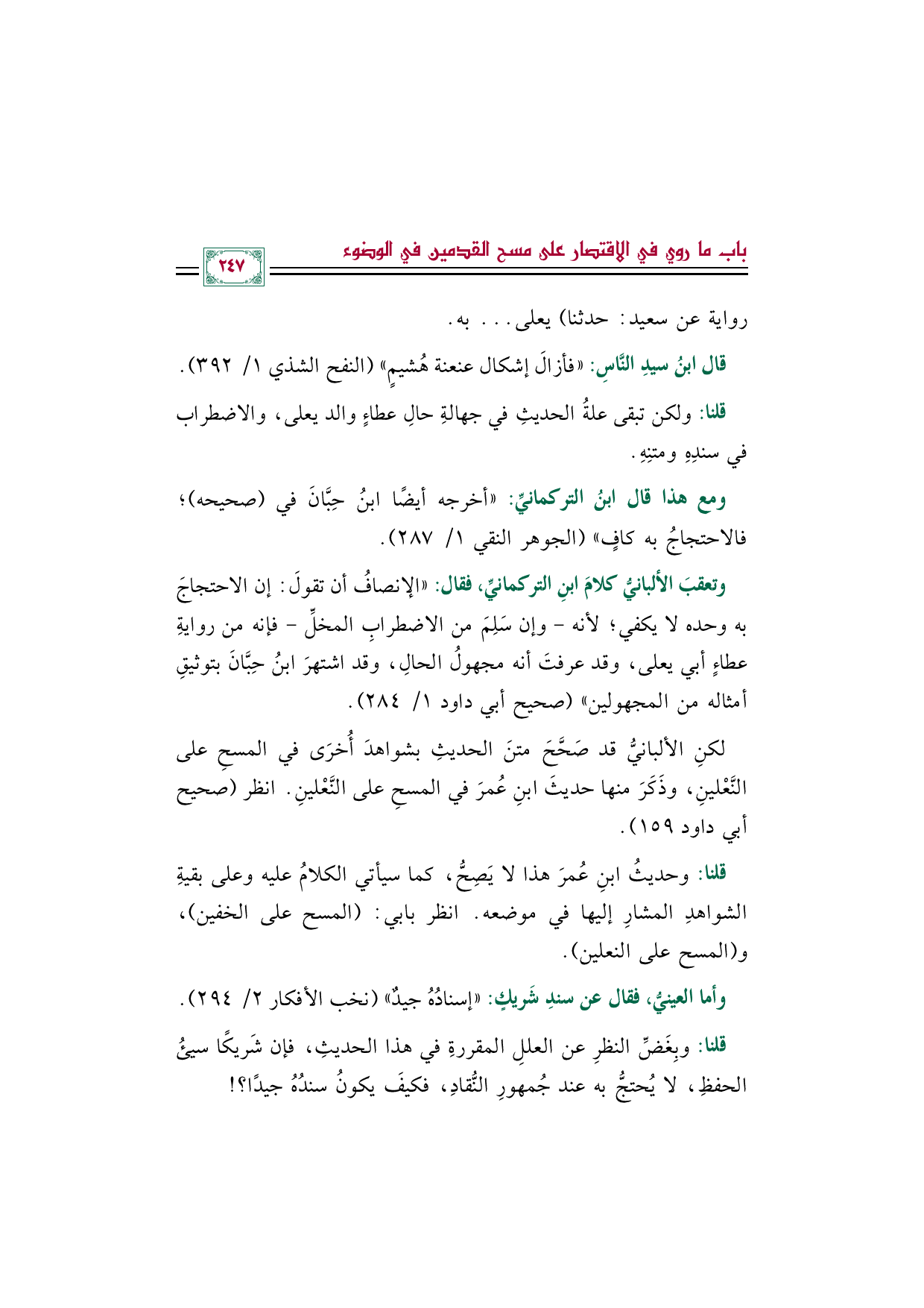 وتعقبَ الألبانيُّ كلامَ ابنِ التركمانيِّ، فقال: "الإنصافُ أن تقولَ: إن الاحتجاجَ به وحده لا يكفي؛ لأنه -وإن سَلِمَ من الاضطرابِ المخلِّ- فإنه من روايةِ عطاءٍ أبي يعلى، وقد عرفتَ أنه مجهولُ الحالِ، وقد اشتهرَ ابنُ حِبَّانَ بتوثيقِ أمثاله من المجهولين" (صحيح أبي داود ١/ ٢٨٤).