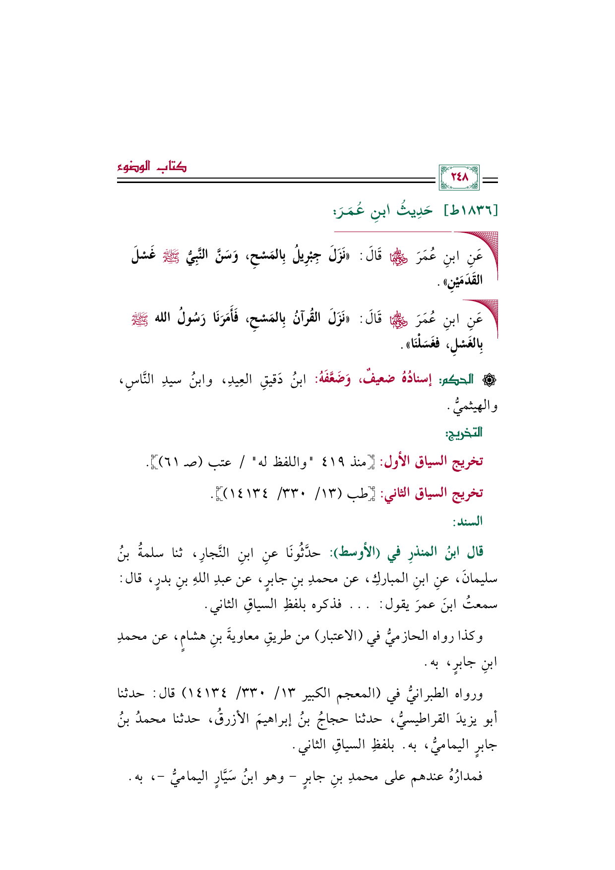 ◼ عَنِ ابنِ عُمَرَ رضي الله عنهما قَالَ: ((نَزَلَ القُرآنُ بِالمَسْحِ، فَأَمَرَنَا رَسُولُ الله صلى الله عليه وسلم بِالغَسْلِ، فغَسَلْنَا)).