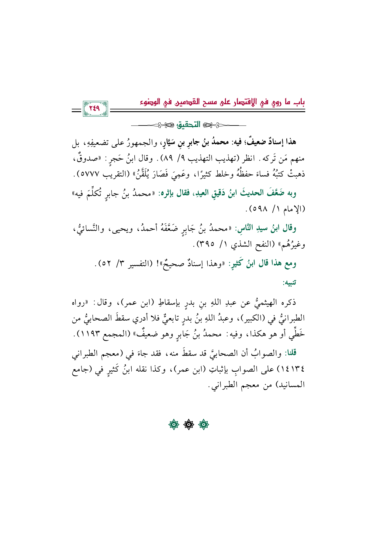 وبه ضَعَّفَ الحديثَ ابنُ دَقيقٍ العيدِ، فقال بإثره: "محمدُ بنُ جابرٍ تُكلِّمَ فيه" (الإمام ١/ ٥٩٨).