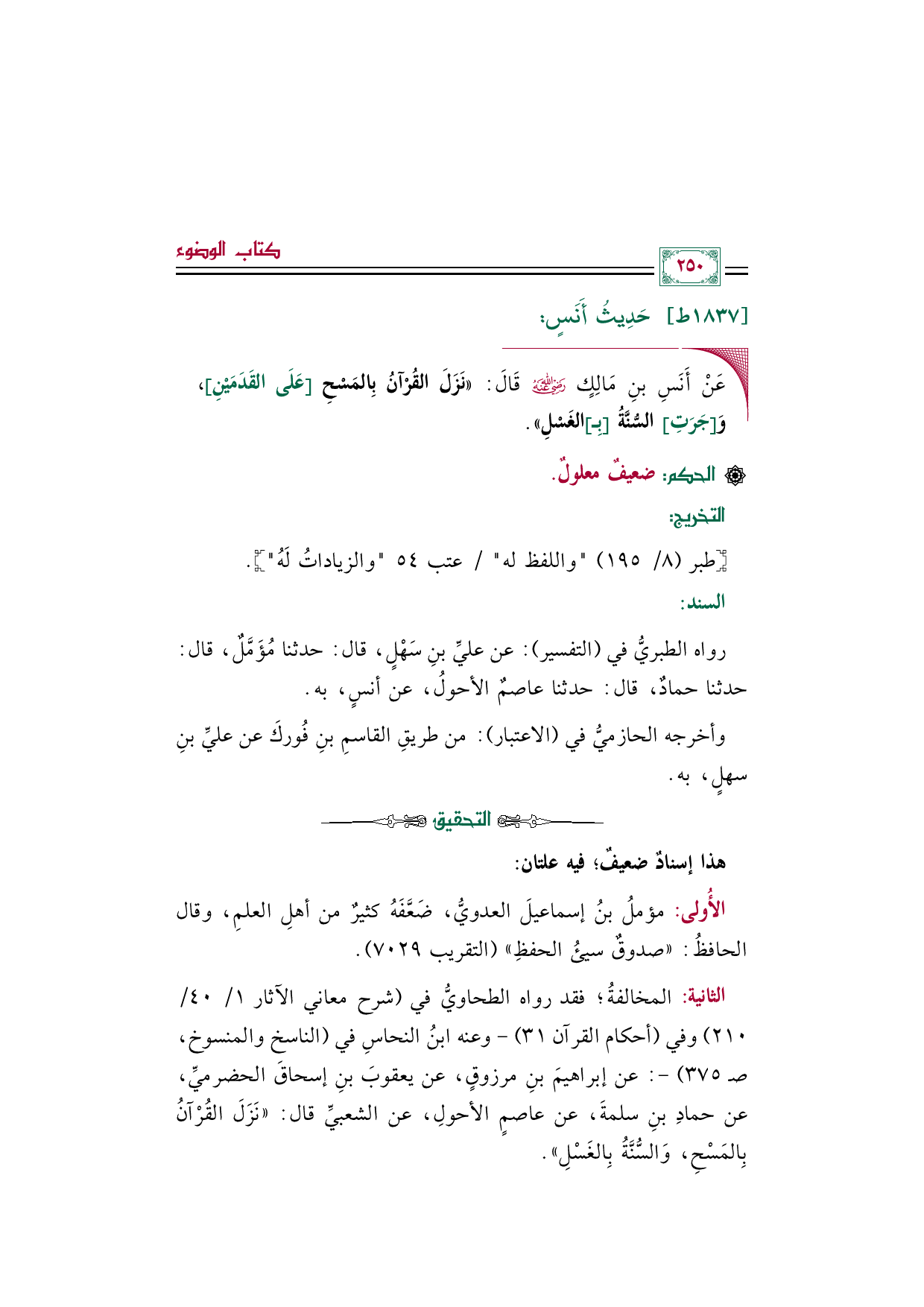 الثانية: المخالفةُ؛ فقد رواه الطحاويُّ في (شرح معاني الآثار ١/ ٤٠/ ٢١٠) وفي (أحكام القرآن ٣١) -وعنه ابنُ النحاسِ في (الناسخ والمنسوخ، صـ ٣٧٥) -: عن إبراهيمَ بنِ مرزوقٍ، عن يعقوبَ بنِ إسحاقَ الحضرميِّ، عن حمادِ بنِ سلمةَ، عن عاصمٍ الأحولِ، عن الشعبيِّ قال: ((نَزَلَ القُرْآنُ بِالمَسْحِ، وَالسُّنَّةُ بِالغَسْلِ)).