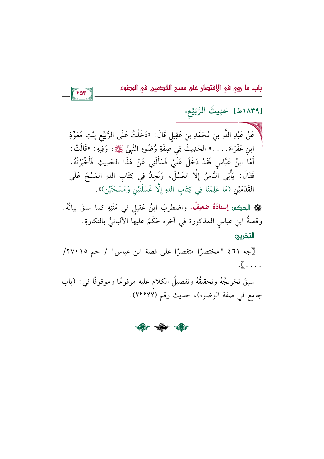 سبقَ تخريجُهُ وتحقيقُهُ وتفصيلُ الكلامِ عليه مرفوعًا وموقوفًا في: (باب جامع في صفة الوضوء)، حديث رقم (؟ ؟ ؟ ؟ ؟ ).