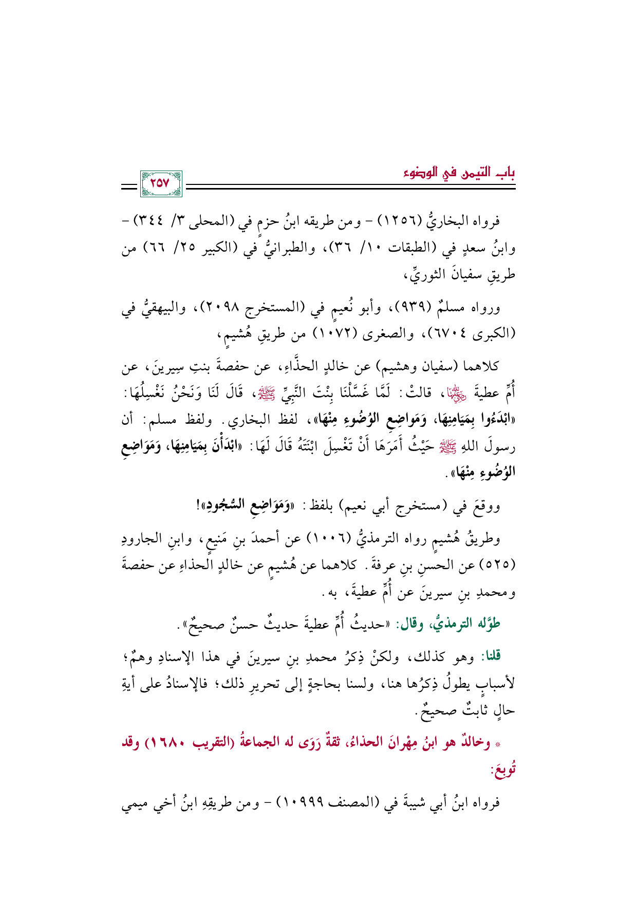 كلاهما (سفيان وهشيم) عن خالدٍ الحذَّاءِ، عن حفصةَ بنتِ سِيرينَ، عن أُمِّ عطيةَ رضي الله عنها، قالتْ: لَمَّا غَسَّلْنَا بِنْتَ النَّبِيِّ صلى الله عليه وسلم، قَالَ لَنَا وَنَحْنُ نَغْسِلُهَا: ((ابْدَءُوا بِمَيَامِنِهَا، وَمَواضِعِ الوُضُوءِ مِنْهَا))، لفظ البخاري. ولفظ مسلم: أن رسولَ اللهِ صلى الله عليه وسلم حَيْثُ أَمَرَهَا أَنْ تَغْسِلَ ابْنَتَهُ قَالَ لَهَا: «ابْدَأْنَ بِمَيَامِنِهَا، وَمَوَاضِعِ الوُضُوءِ مِنْهَا».