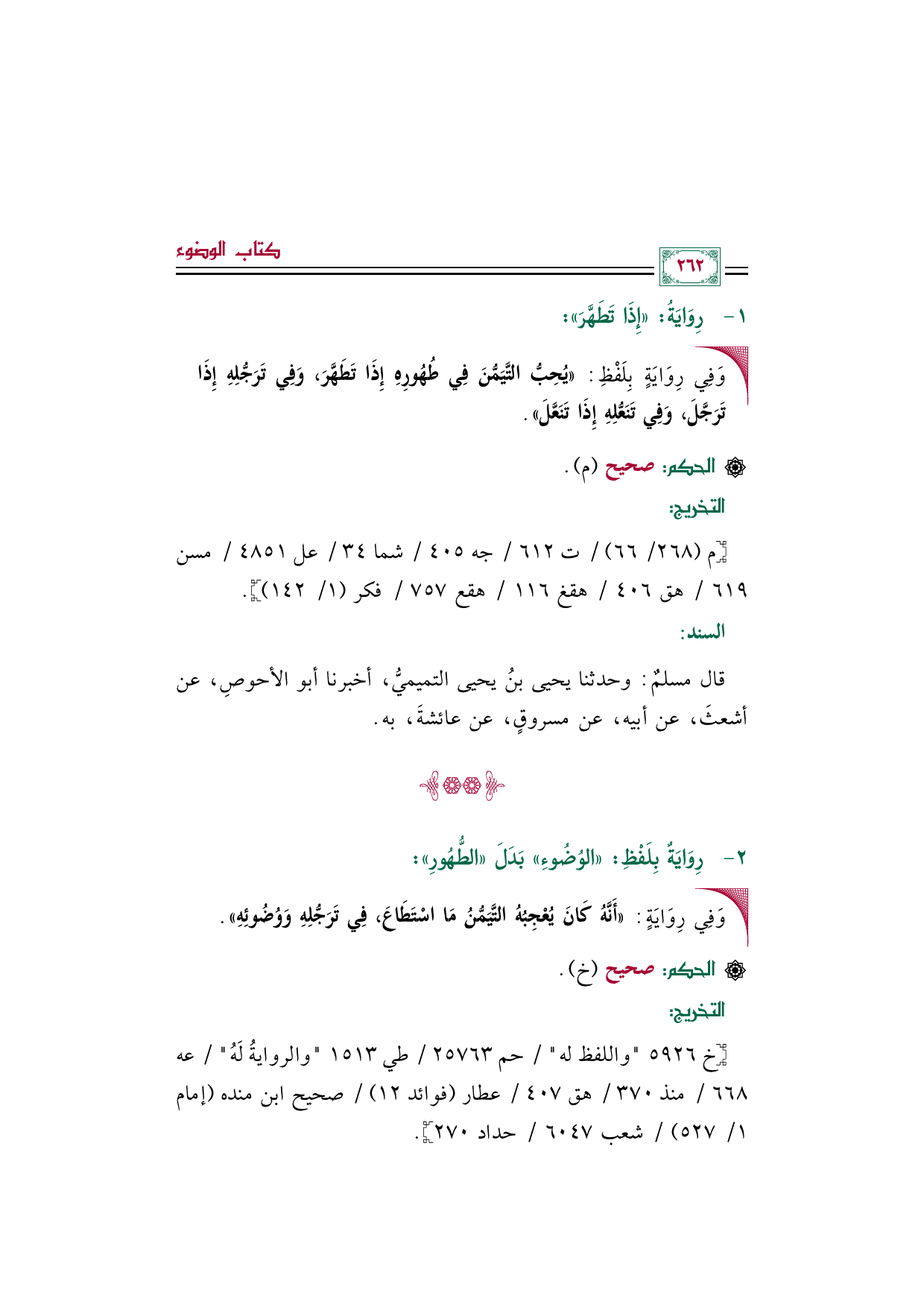 • وَفِي رِوَايَةٍ بِلَفْظِ: «يُحِبُّ التَّيَمُّنَ فِي طُهُورِهِ إِذَا تَطَهَّرَ، وَفِي تَرَجُّلِهِ إِذَا تَرَجَّلَ، وَفِي تَنَعُّلِهِ إِذَا تَنَعَّلَ».