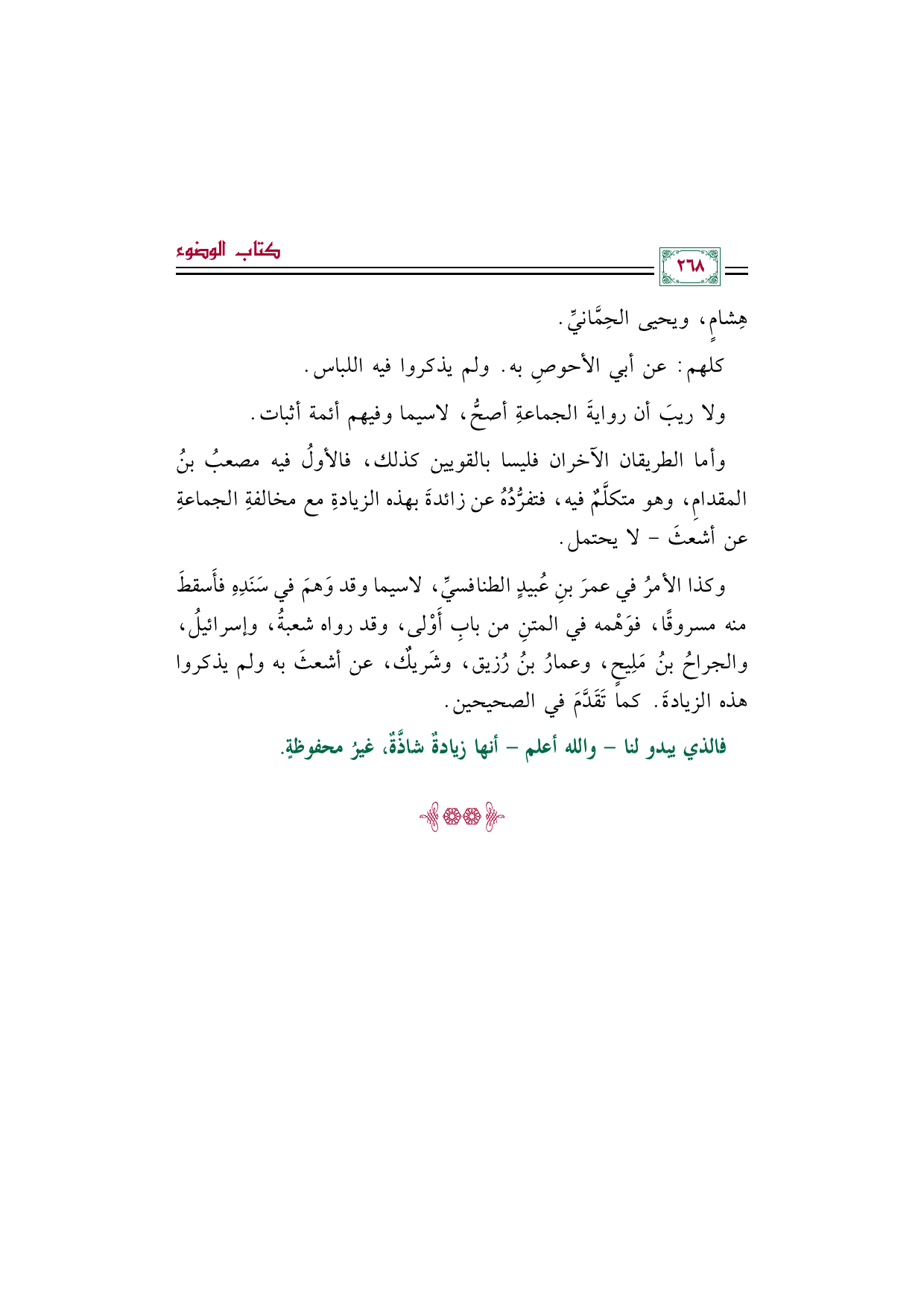 وكذا الأمرُ في عمرَ بنِ عُبيدٍ الطنافسيِّ، لاسيما وقد وَهمَ في سَنَدِهِ فأَسقطَ منه مسروقًا، فوَهْمه في المتنِ من بابِ أَوْلى، وقد رواه شعبةُ، وإسرائيلُ، والجراحُ بنُ مَلِيحٍ، وعمارُ بنُ رُزيق، وشَريكٌ، عن أشعثَ به ولم يذكروا هذه الزيادةَ. كما تَقَدَّمَ في الصحيحين.