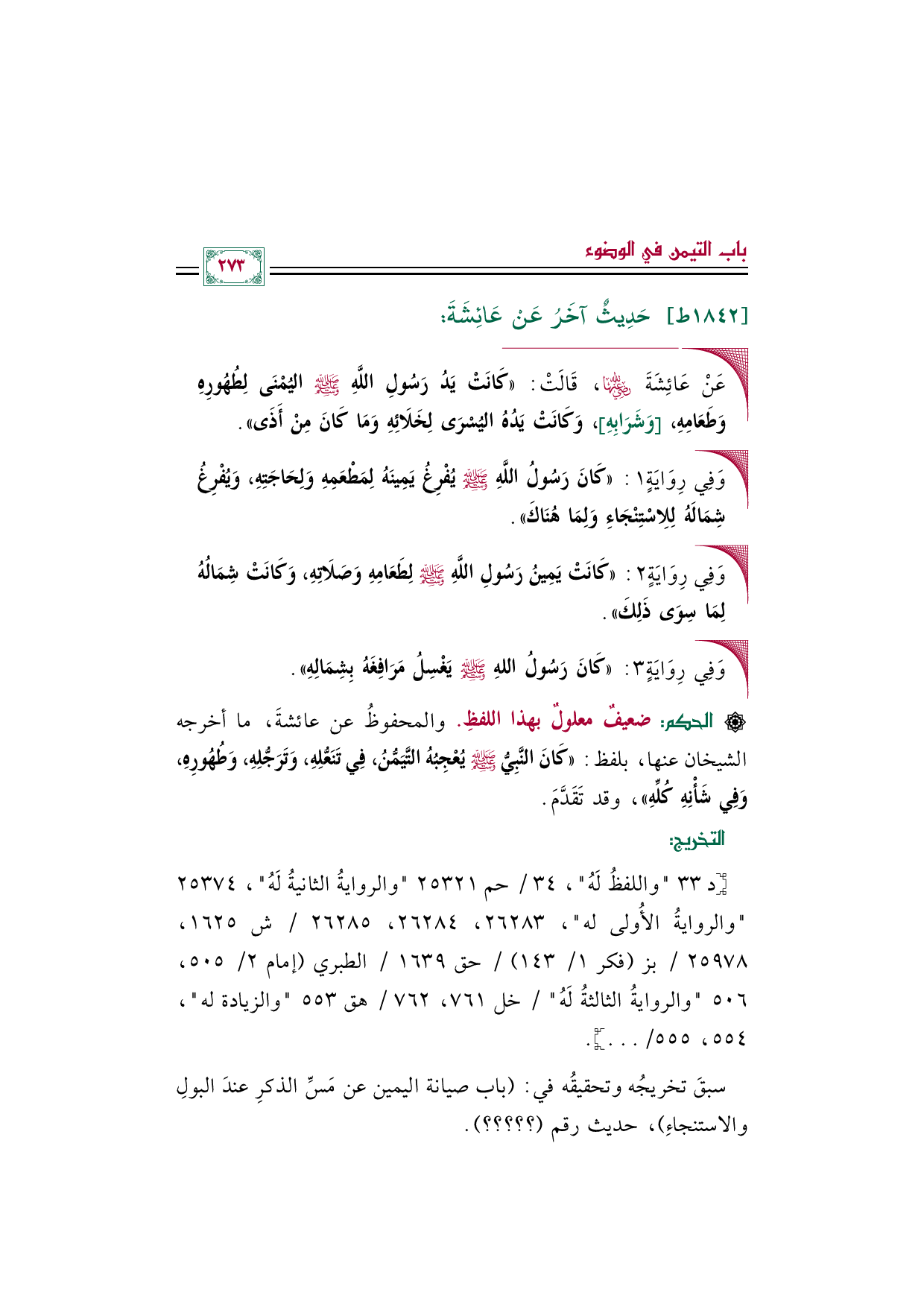 [الحكم]: ضعيفٌ معلولٌ بهذا اللفظِ. والمحفوظُ عن عائشةَ، ما أخرجه الشيخان عنها، بلفظ: ((كَانَ النَّبِيُّ صلى الله عليه وسلم يُعْجِبُهُ التَّيَمُّنُ، فِي تَنَعُّلِهِ، وَتَرَجُّلِهِ، وَطُهُورِهِ، وَفِي شَأْنِهِ كُلِّهِ))، وقد تَقَدَّمَ.