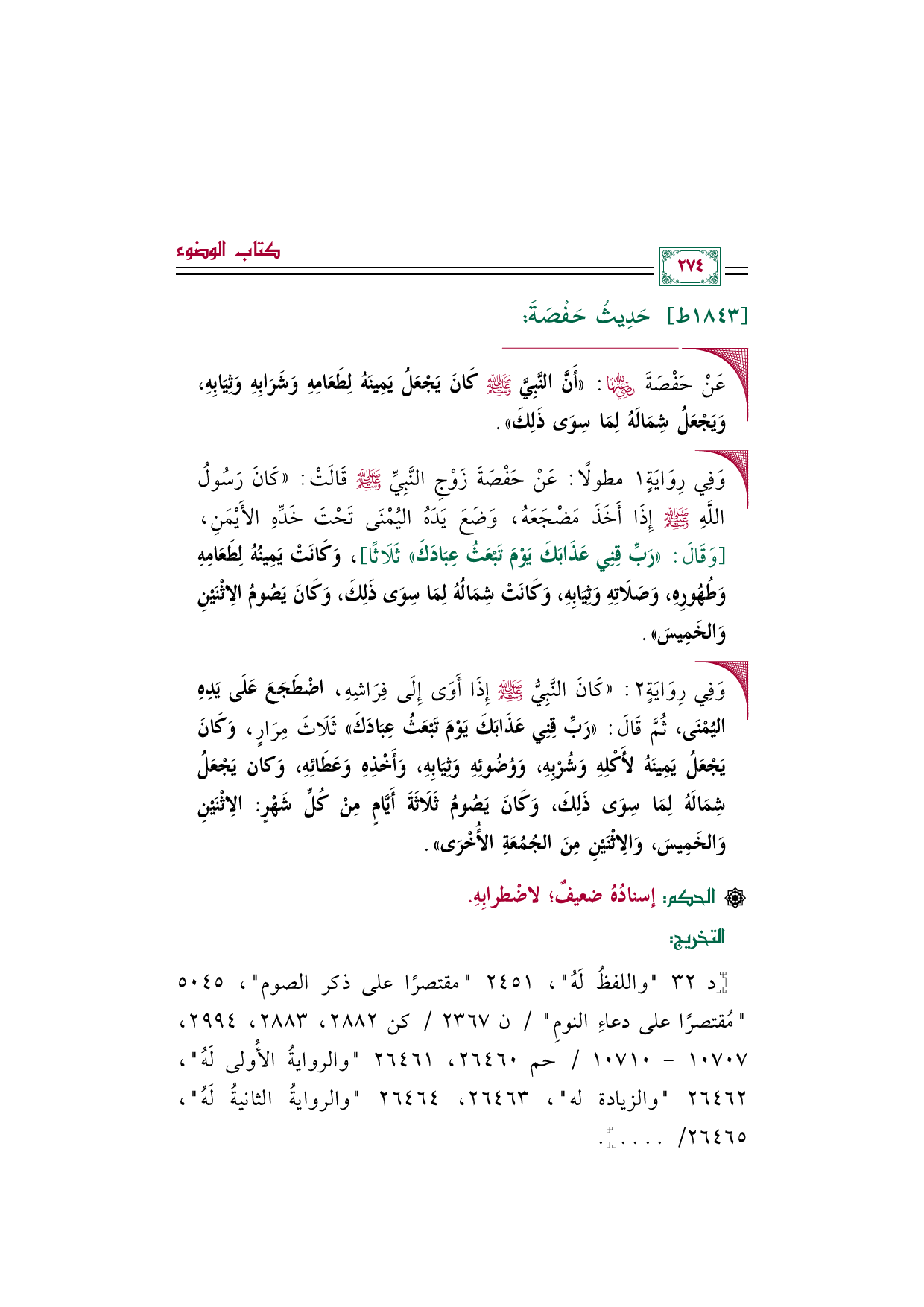 •وَفِي رِوَايَةٍ ٢: ((كَانَ النَّبِيُّ صلى الله عليه وسلم إِذَا أَوَى إِلَى فِرَاشِهِ، اضْطَجَعَ عَلَى يَدِهِ اليُمْنَى، ثُمَّ قَالَ: «رَبِّ قِنِي عَذَابَكَ يَوْمَ تَبْعَثُ عِبَادَكَ» ثَلَاثَ مِرَارٍ، وَكَانَ يَجْعَلُ يَمِينَهُ لأَكْلِهِ وَشُرْبِهِ، وَوُضُوئِهِ وَثِيَابِهِ، وَأَخْذِهِ وَعَطَائِهِ، وَكان يَجْعَلُ شِمَالَهُ لِمَا سِوَى ذَلِكَ، وَكَانَ يَصُومُ ثَلَاثَةَ أَيَّامٍ مِنْ كُلِّ شَهْرٍ: الِاثْنَيْنِ وَالخَمِيسَ، وَالِاثْنَيْنِ مِنَ الجُمُعَةِ الأُخْرَى)).