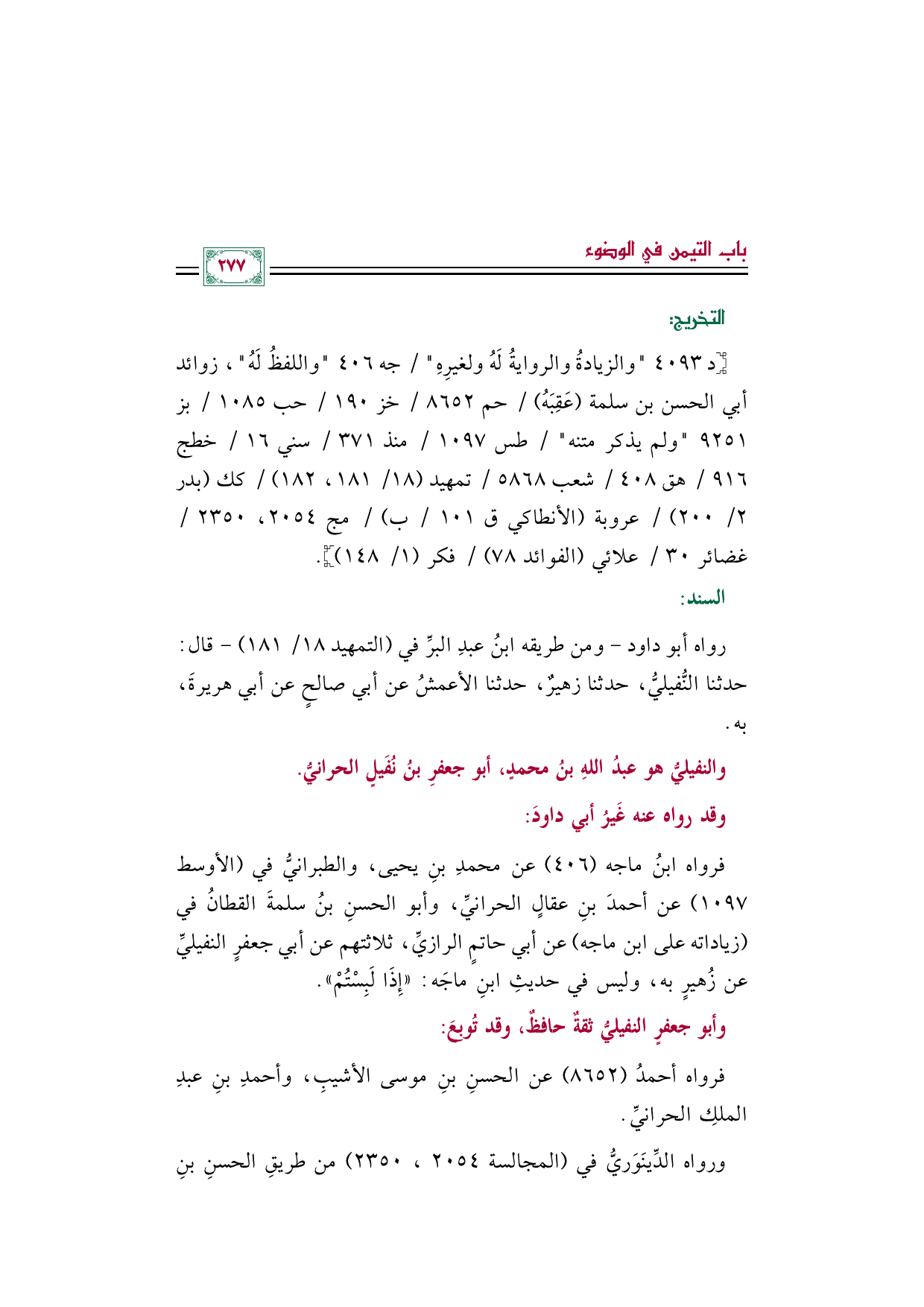 رواه أبو داود -ومن طريقه ابنُ عبدِ البرِّ في (التمهيد ١٨/ ١٨١) - قال: حدثنا النُّفيليُّ، حدثنا زهيرٌ، حدثنا الأعمشُ عن أبي صالحٍ عن أبي هريرةَ، به.